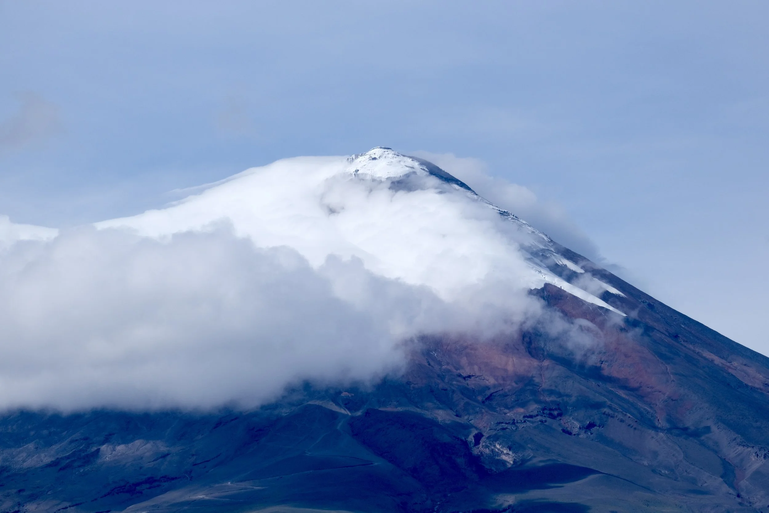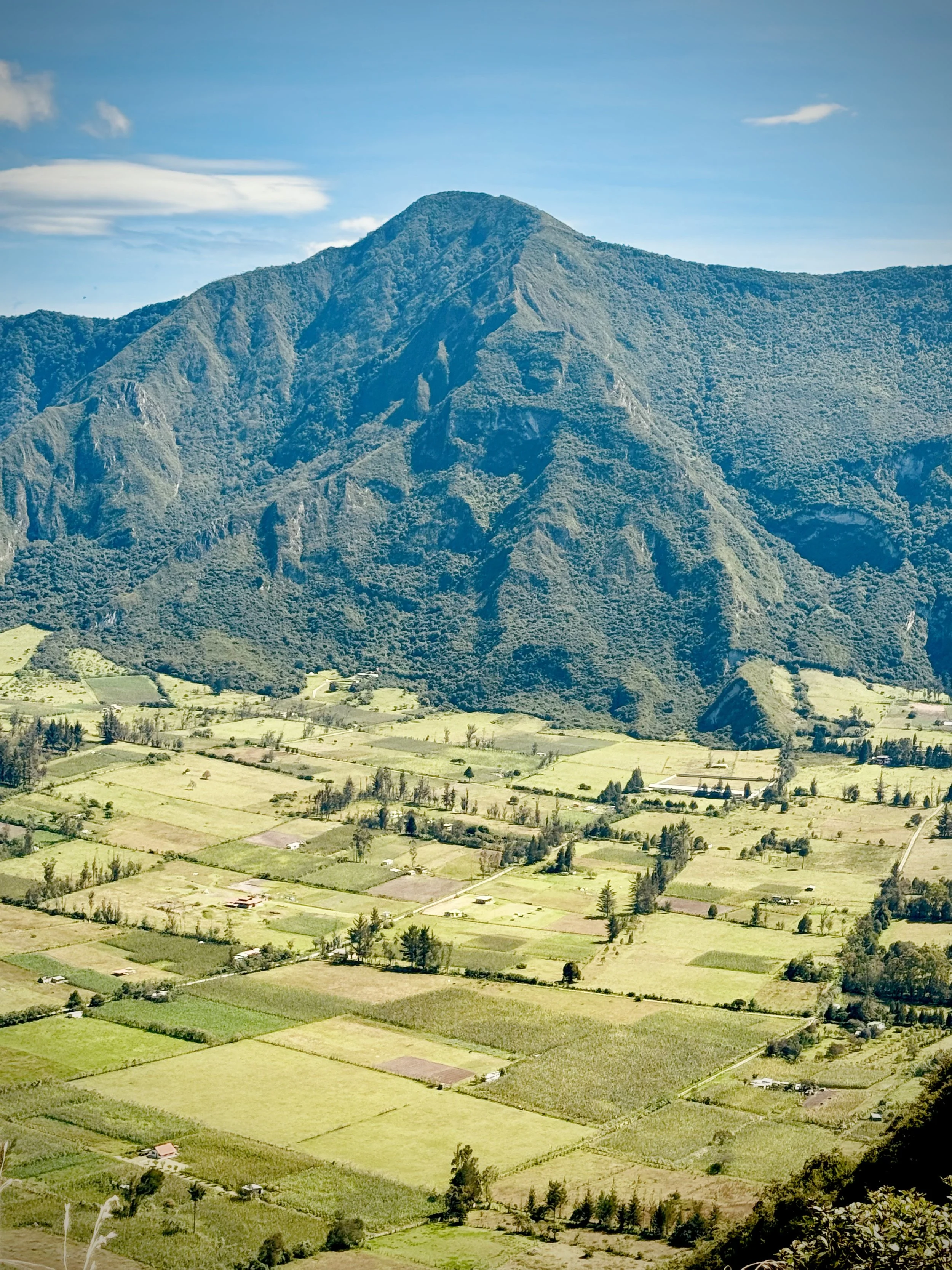 View of a large green mountain with terraced farmland and scattered houses at its base under a blue sky.