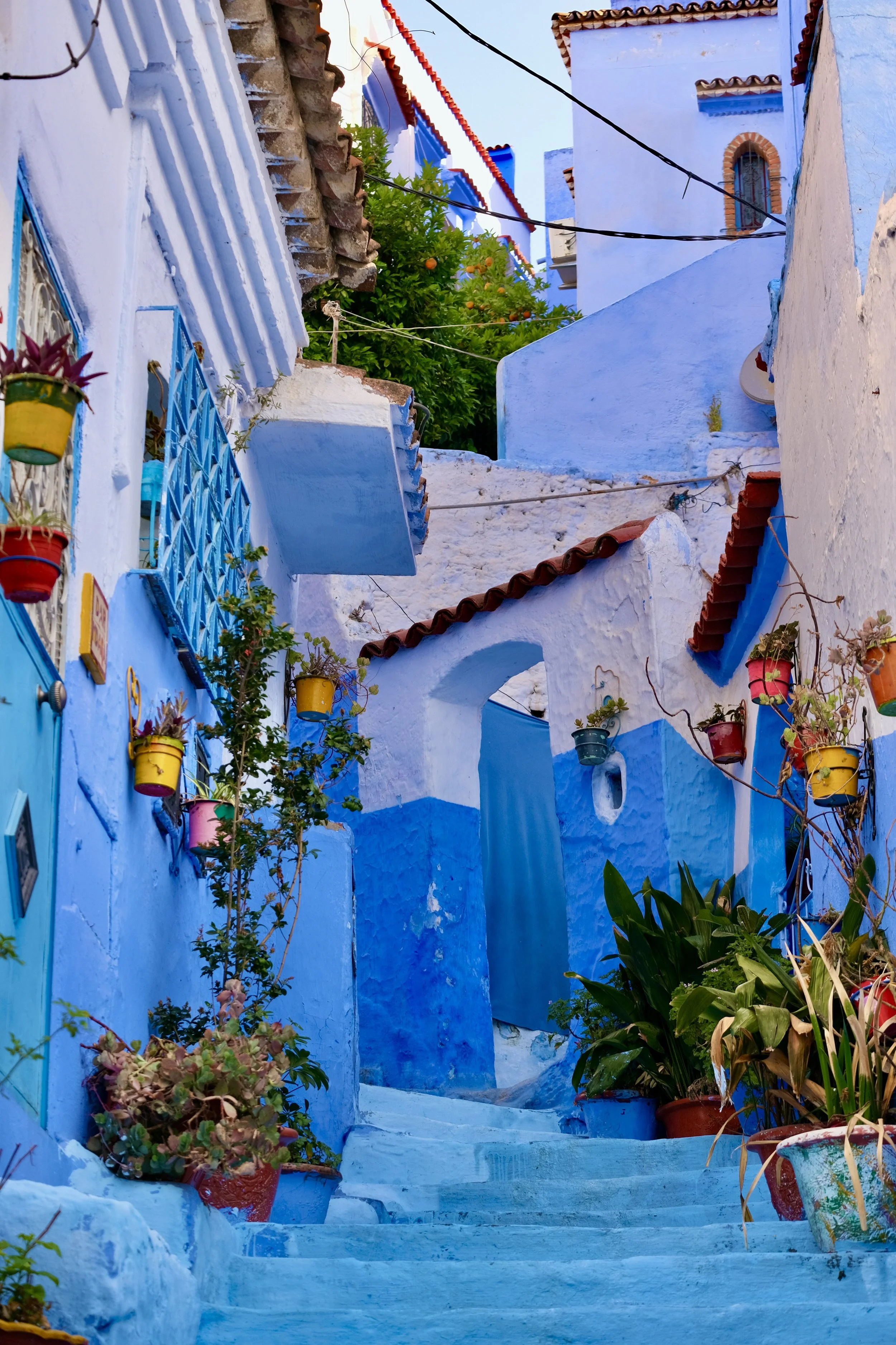 Narrow street in Chefchaouen, Morocco, with blue-painted buildings, potted plants, and colorful hanging planters.