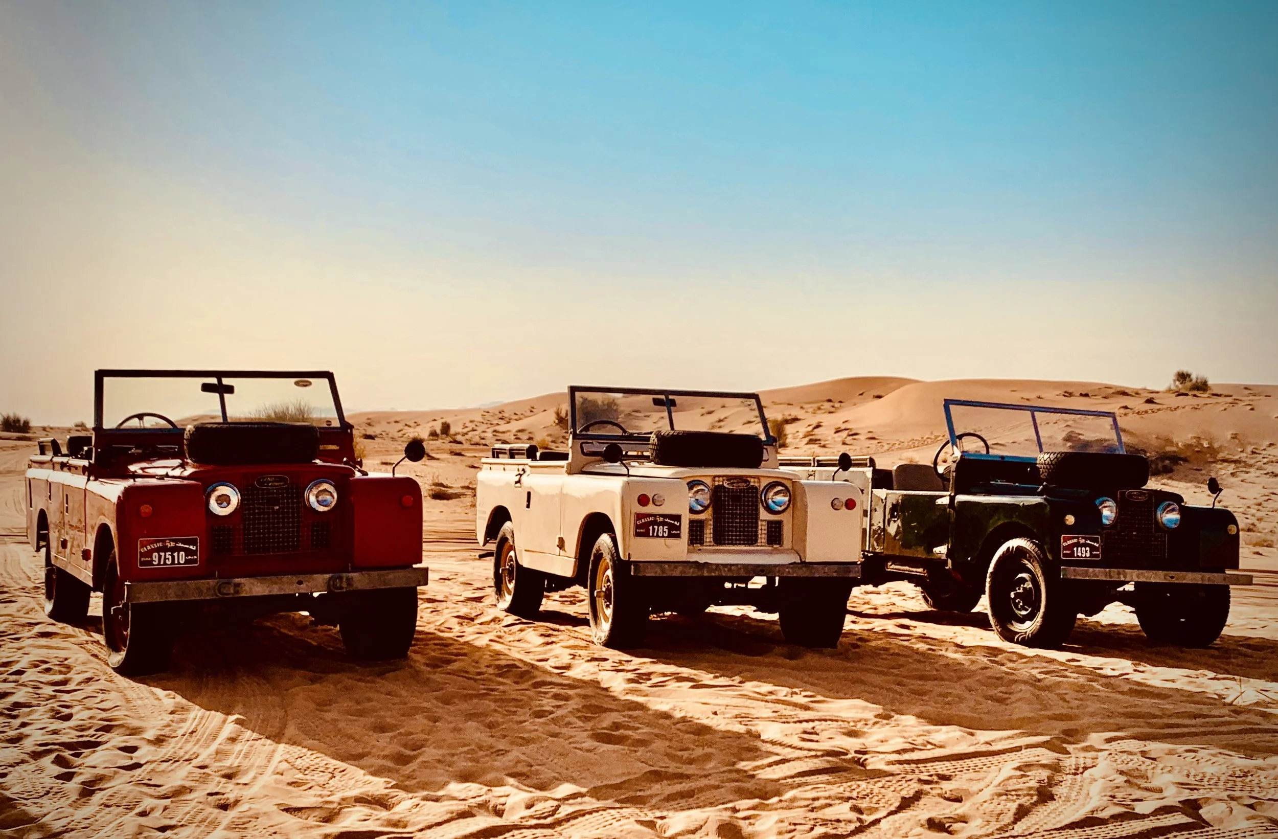 Three vintage off-road vehicles parked on desert sand with sand dunes and a clear blue sky in the background.