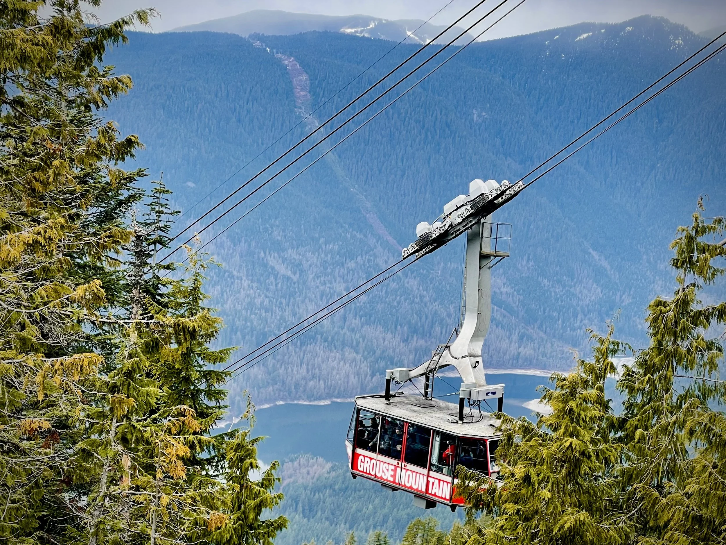 Grouse Mountain aerial tramway ascending through tall green trees with a mountain and lake in the background
