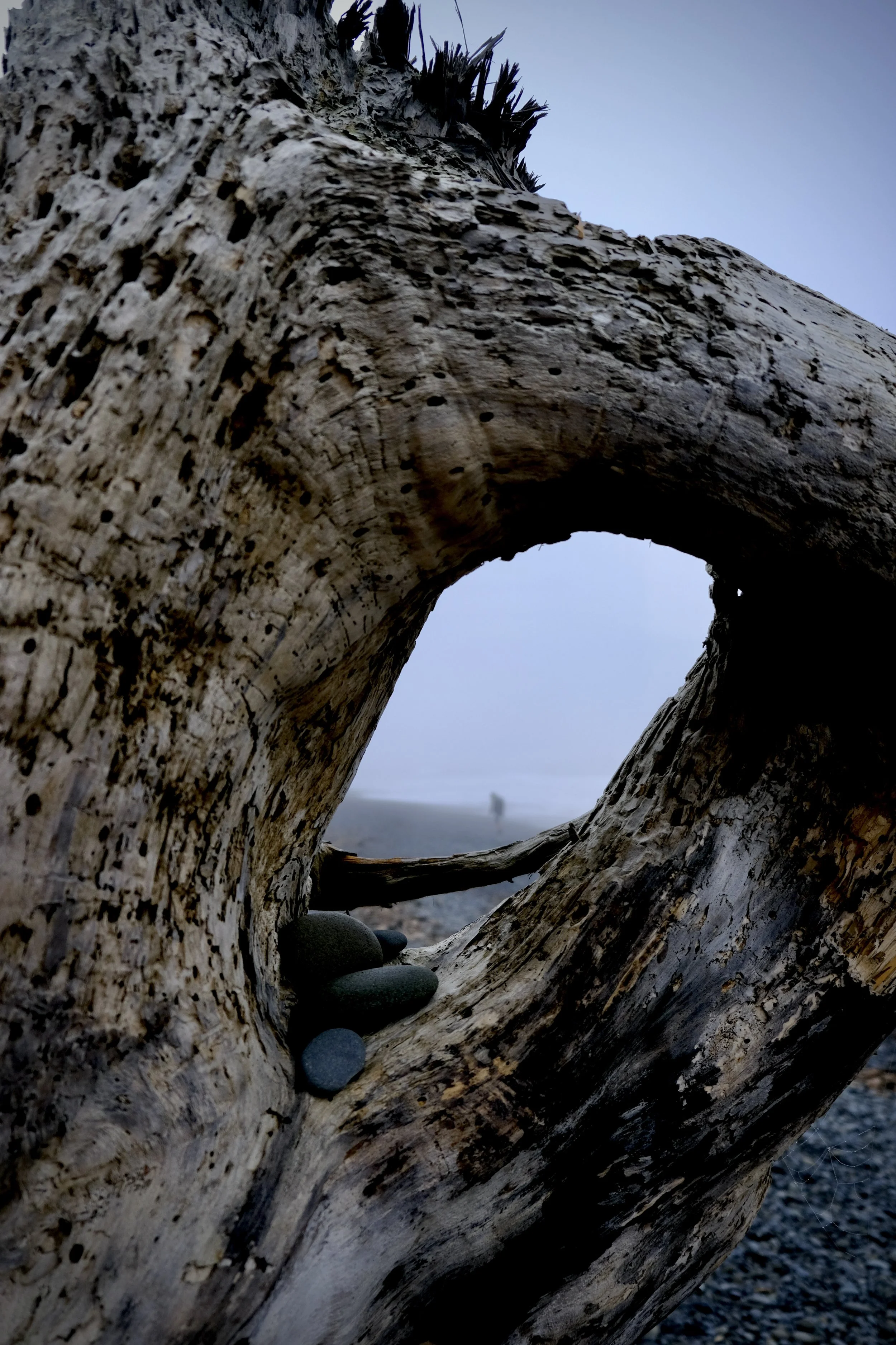 Close-up of a large, weathered driftwood log with a circular hole in the center, positioned on a foggy beach. The background shows a misty shoreline with a person walking.