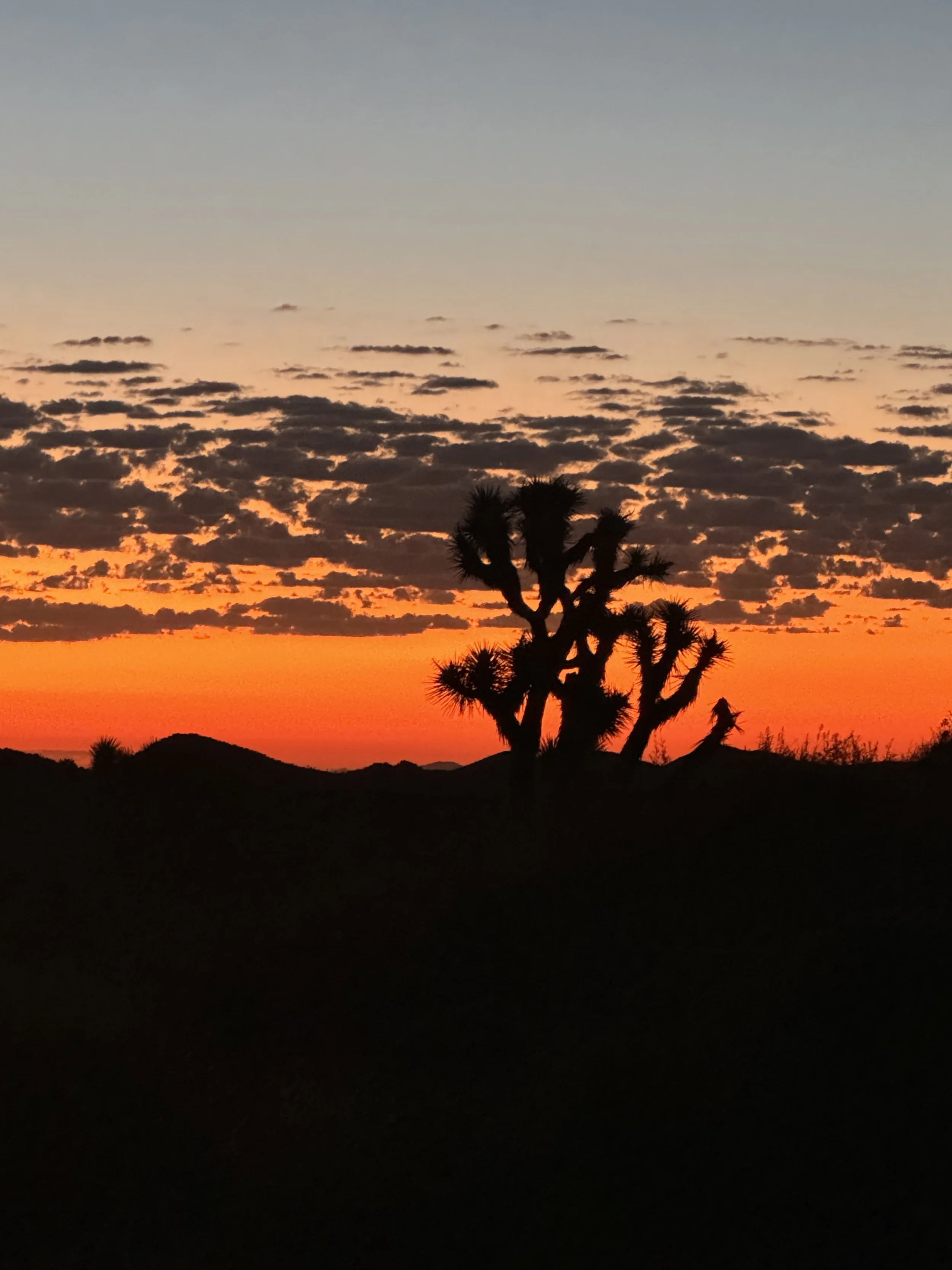 Silhouette of a Joshua tree against an orange and blue sunset sky with scattered clouds and mountain silhouettes in the background.