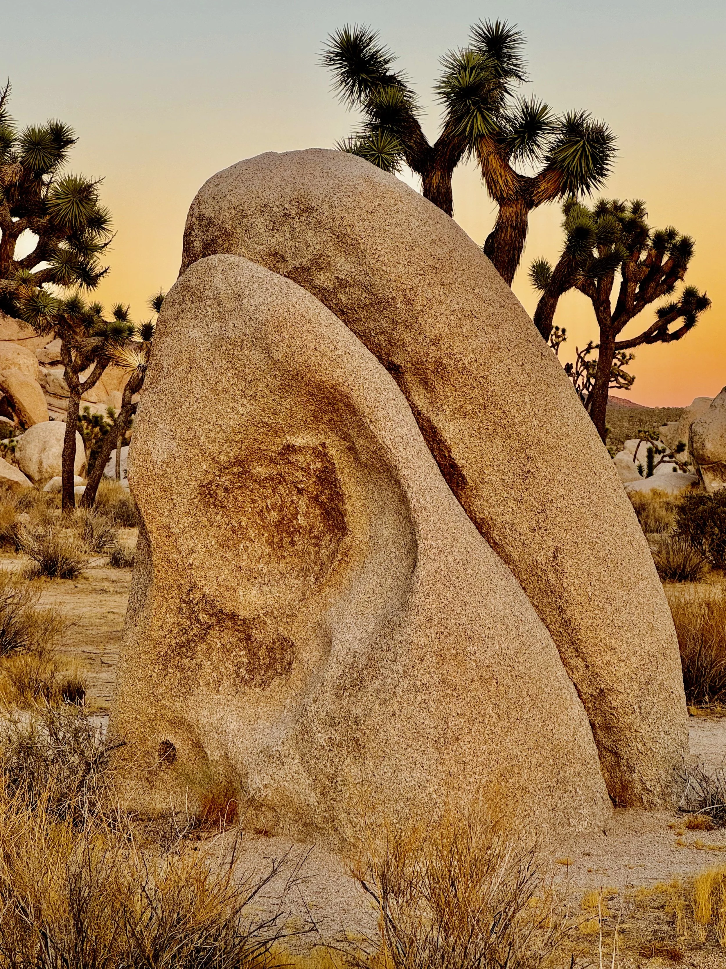 Large rock formation in a desert landscape with Joshua trees and desert plants at sunset.