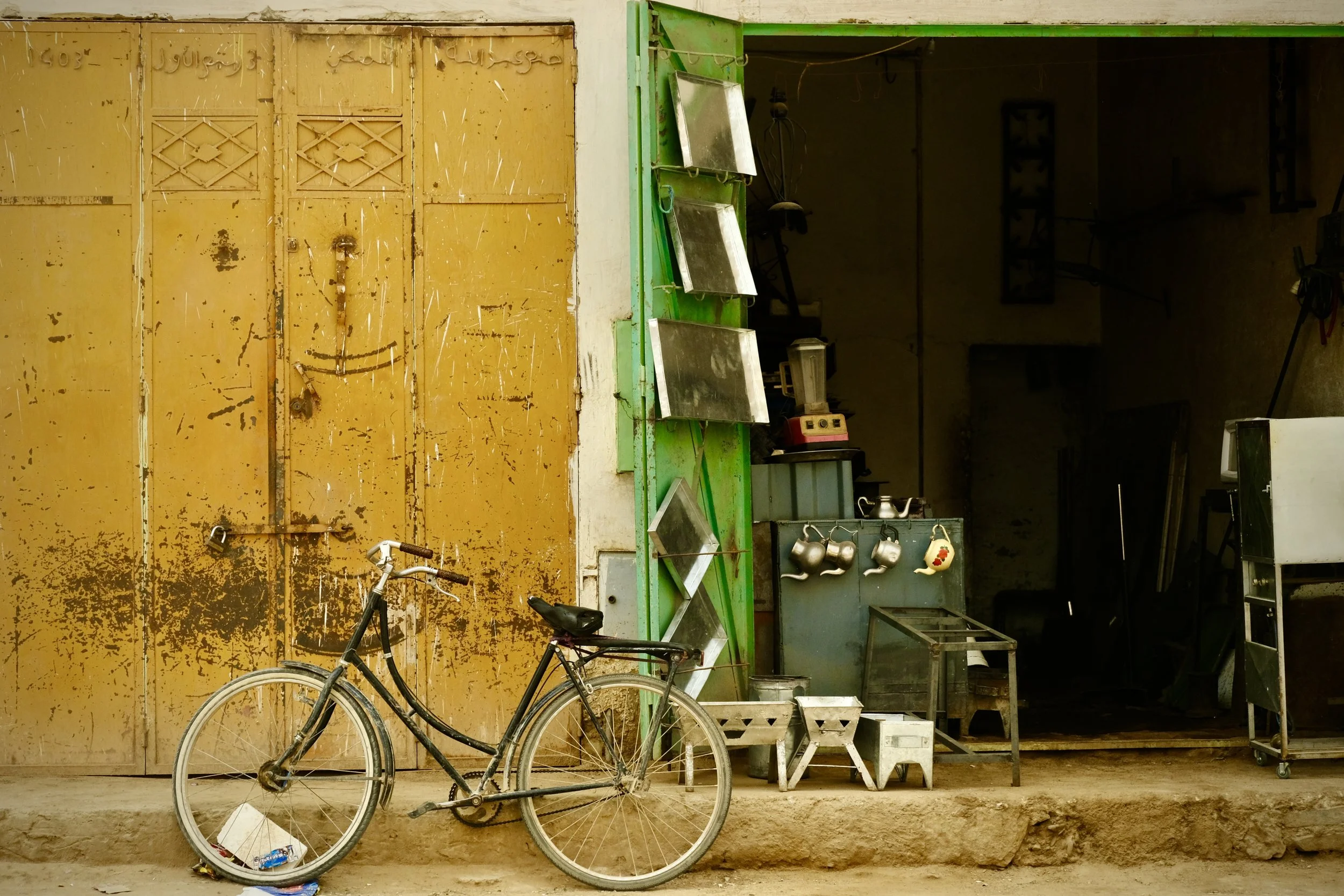 A vintage bicycle parked in front of a weathered yellow door with a smiling face drawn on it. To the right, there's a small shop with kitchen utensils hanging and various old appliances inside.