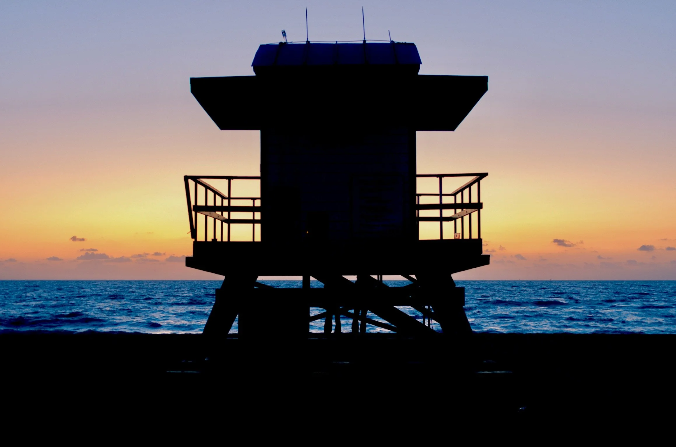 Silhouette of a lifeguard tower on the beach during sunset with the ocean and colorful sky in the background.