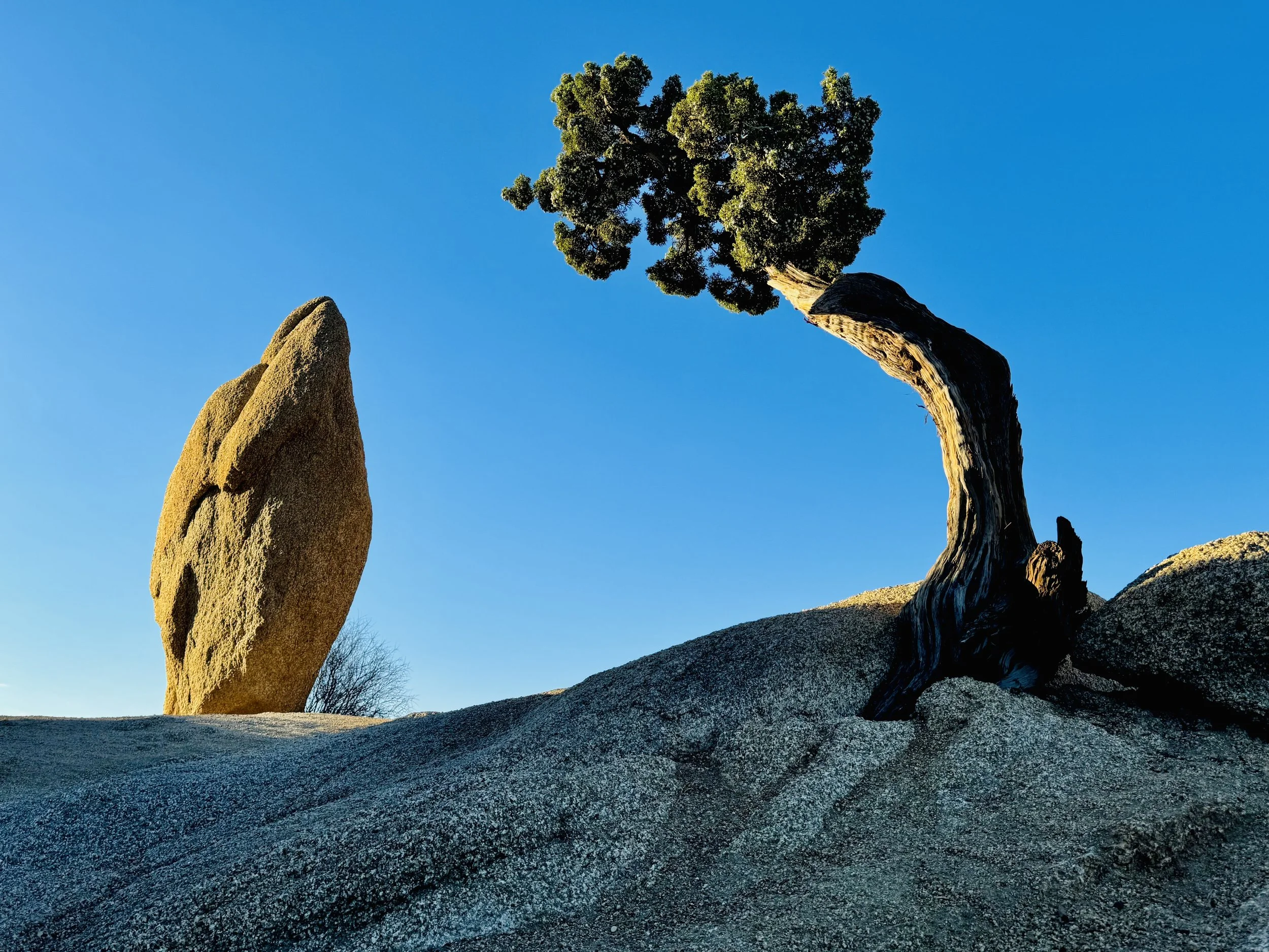 Joshua Tree National Park is a US National Park located in southeastern California. Penguin Rock with Juniper Tree. A twisted, gnarled tree with green foliage growing on a large rock formation against a clear blue sky.