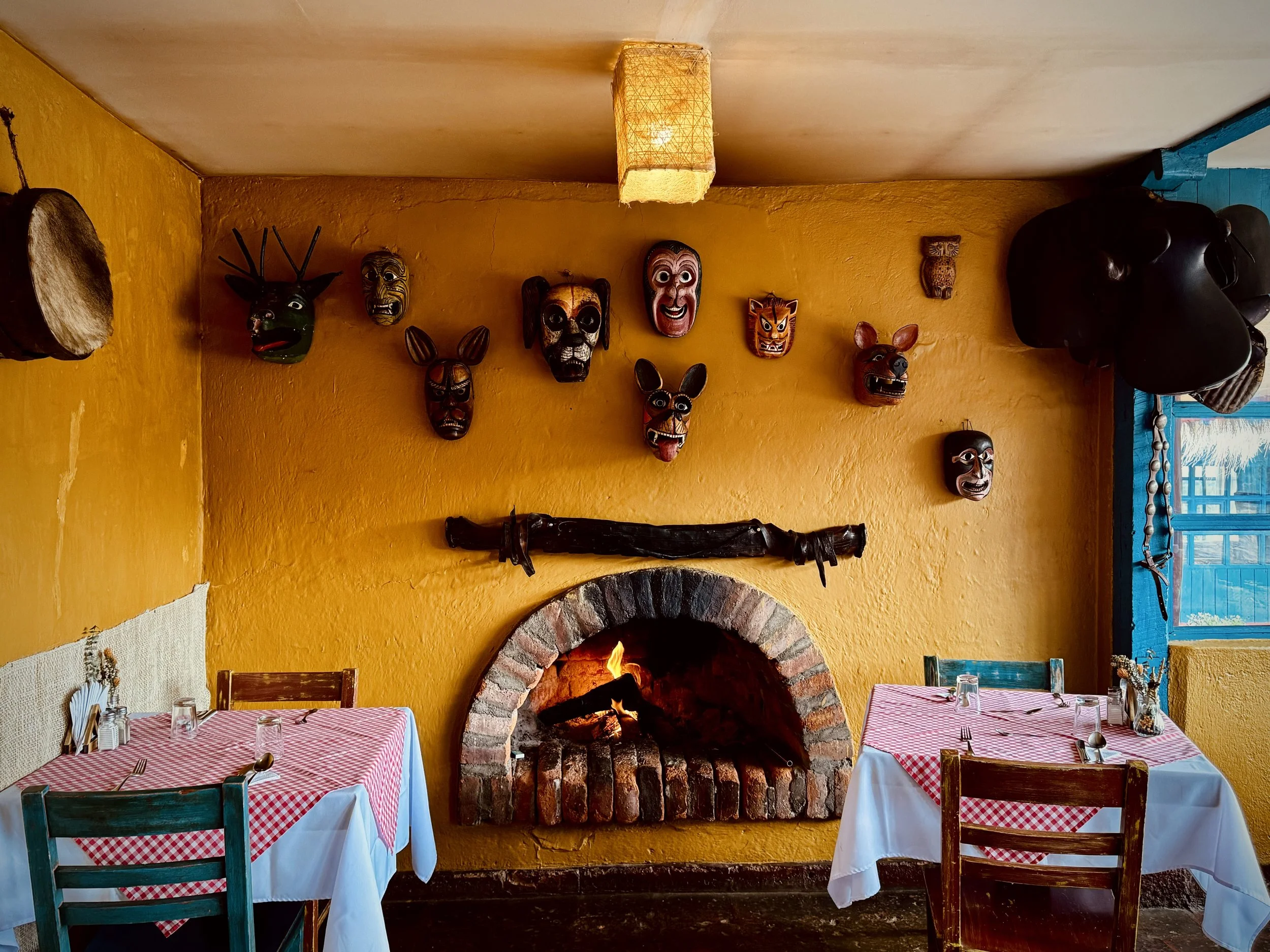Decorative masks are hung on a yellow wall above a brick fireplace with a fire burning inside. There are two tables set with red checkered tablecloths and chairs, with utensils and glasses on them. The room has a warm, cozy atmosphere.