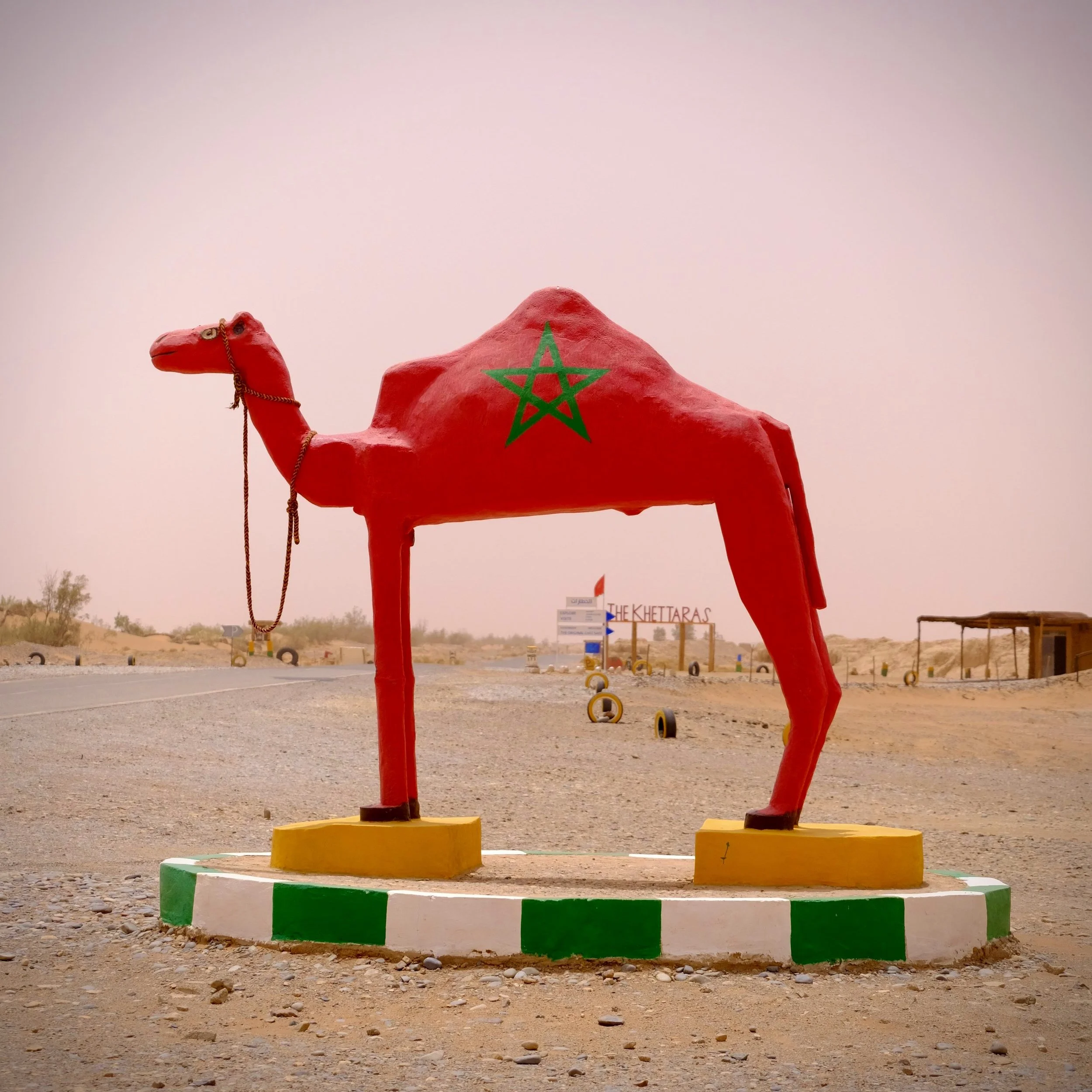 A large red camel sculpture with a green star on its side, standing on a painted green and white circular base in a desert landscape. In the background, there are signs and structures, with the word 'Khettaras' visible.