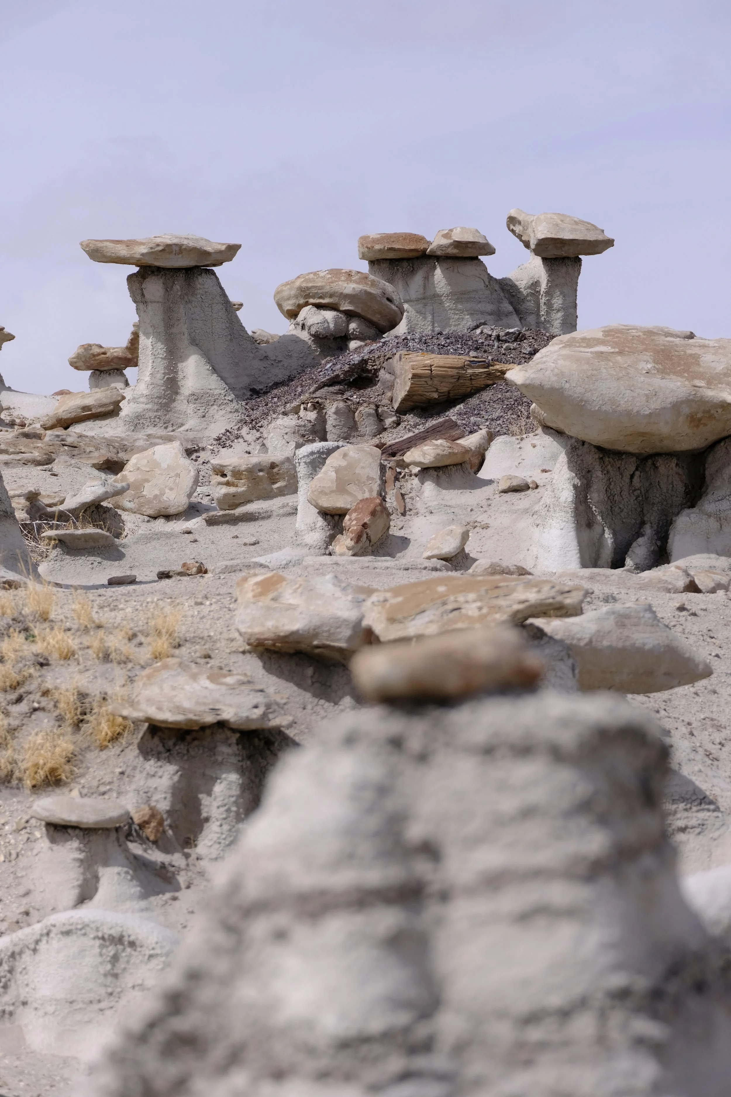 White rock formations resembling hoodoos in a desert landscape under a cloudy sky. Bisti Badlands/De-Na-Zin Wilderness is a sprawling geologic formation near Farmington on the Navajo Nation.
