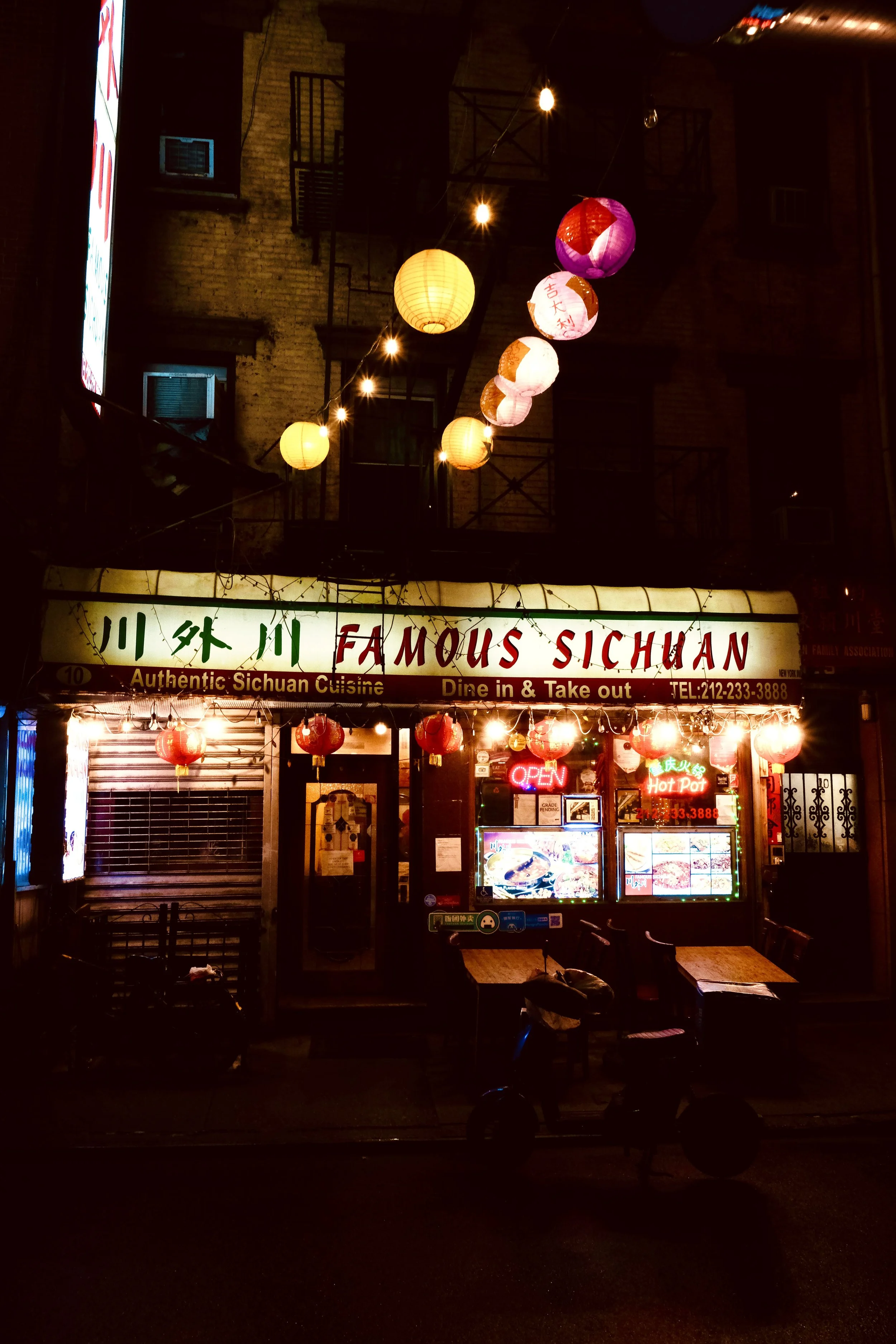 Night view of a Chinese restaurant with illuminated red lanterns, a sign reading "Famous Sichuan," and colorful paper lanterns hanging above the entrance.