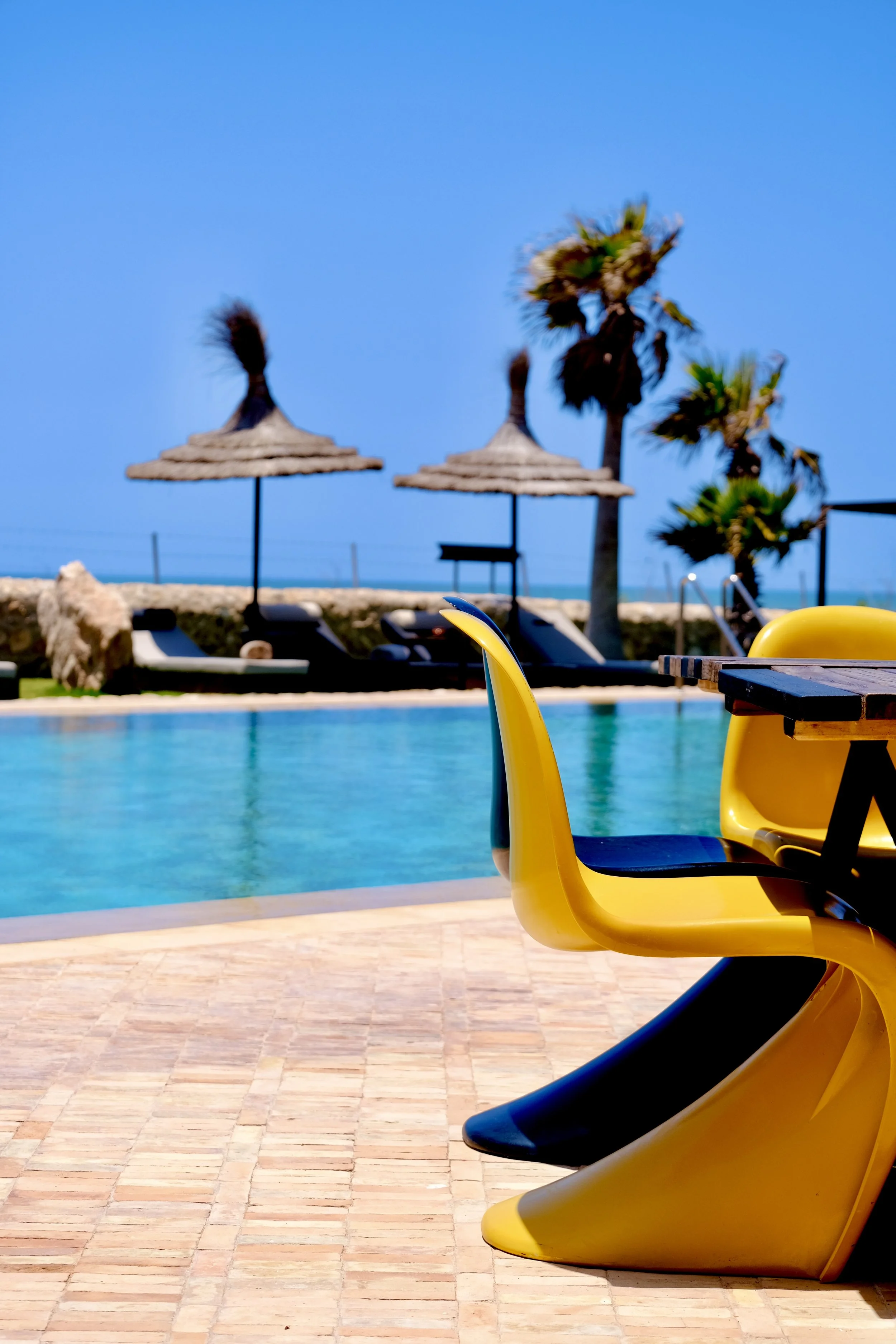 Poolside scene with yellow chair, swimming pool, palm trees, and thatched umbrellas under a clear blue sky.