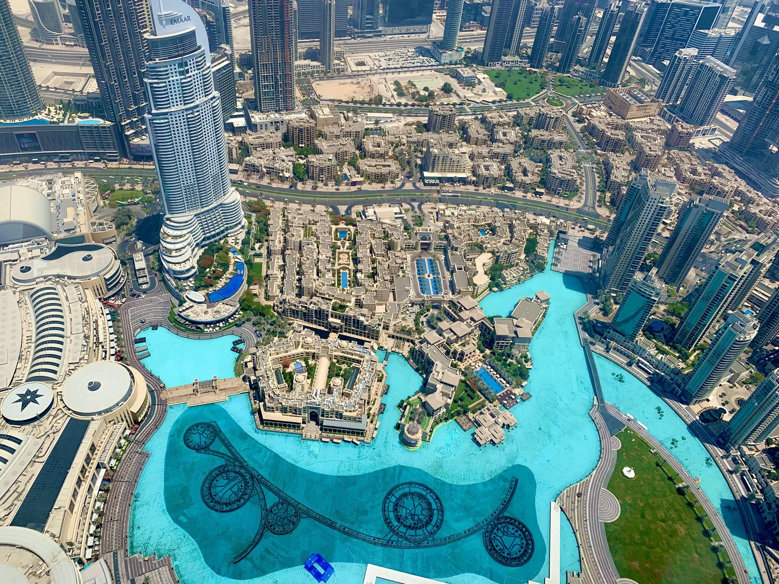 Aerial view of a modern cityscape featuring tall skyscrapers, a large outdoor resort pool area, and surrounding urban infrastructure.