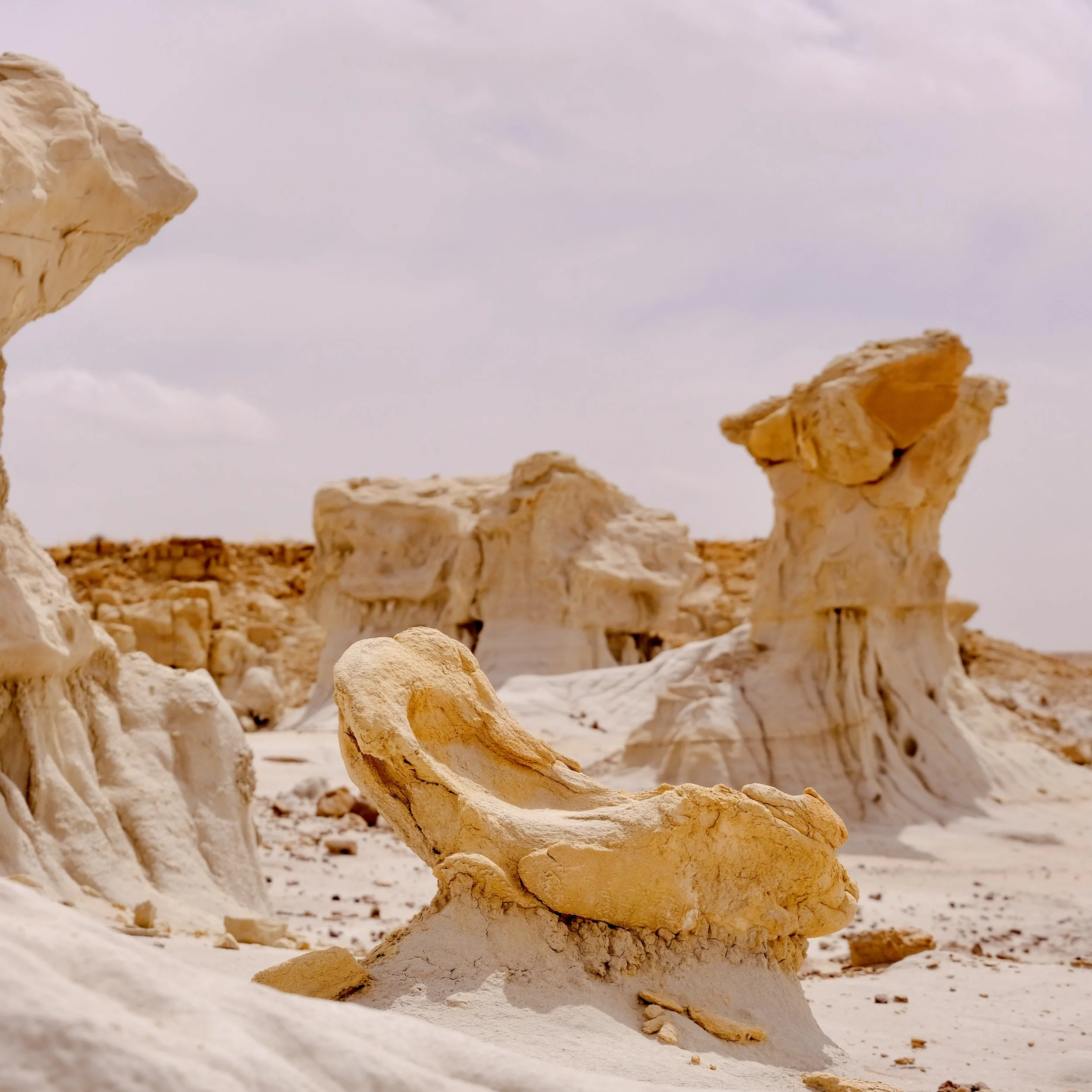 Rock formations resembling fairy chimneys in a desert landscape under a cloudy sky.