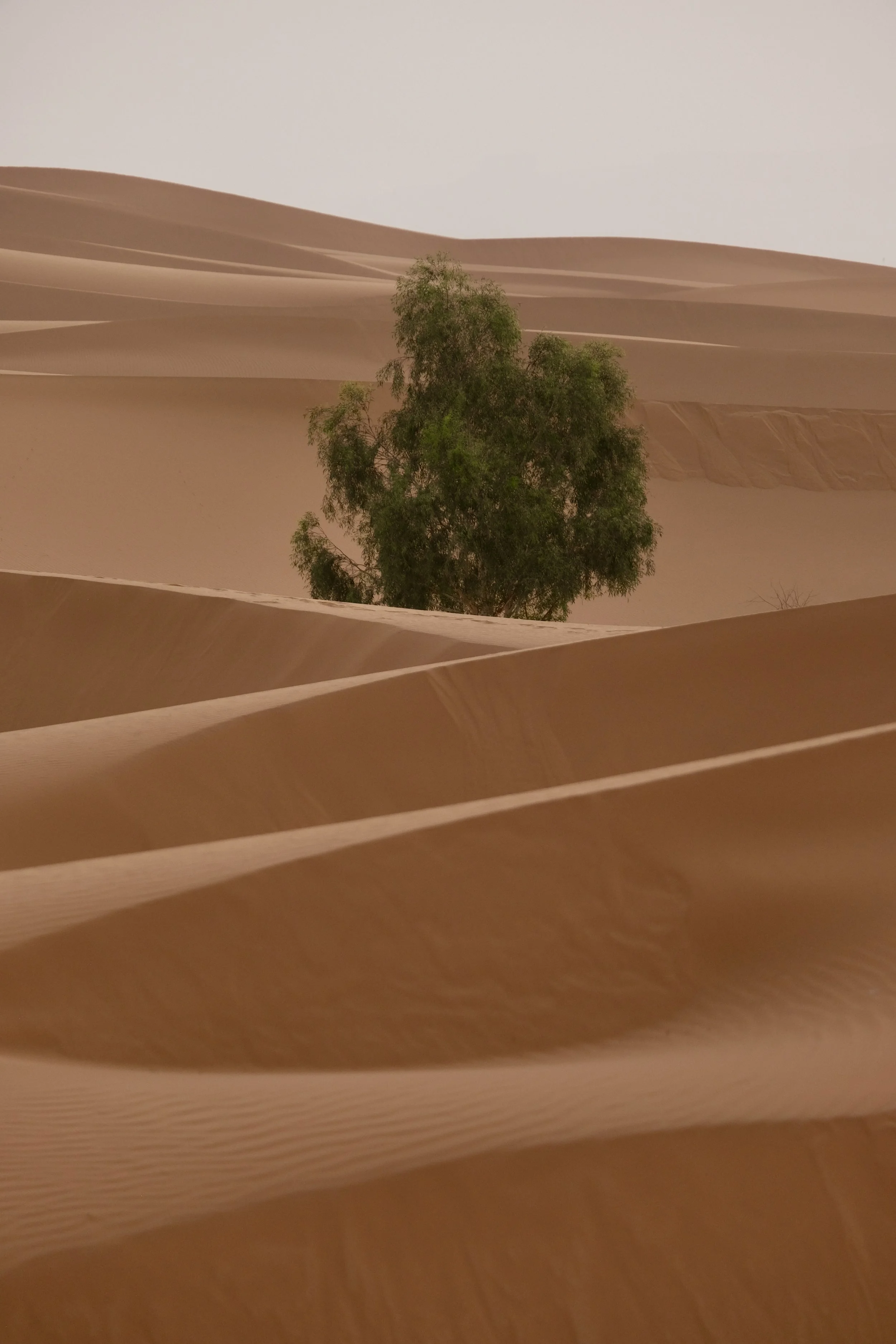 A solitary green tree growing among vast sand dunes in a desert landscape. Sahara Desert is located along the southern border with Algeria, south of the Atlas Mountains.