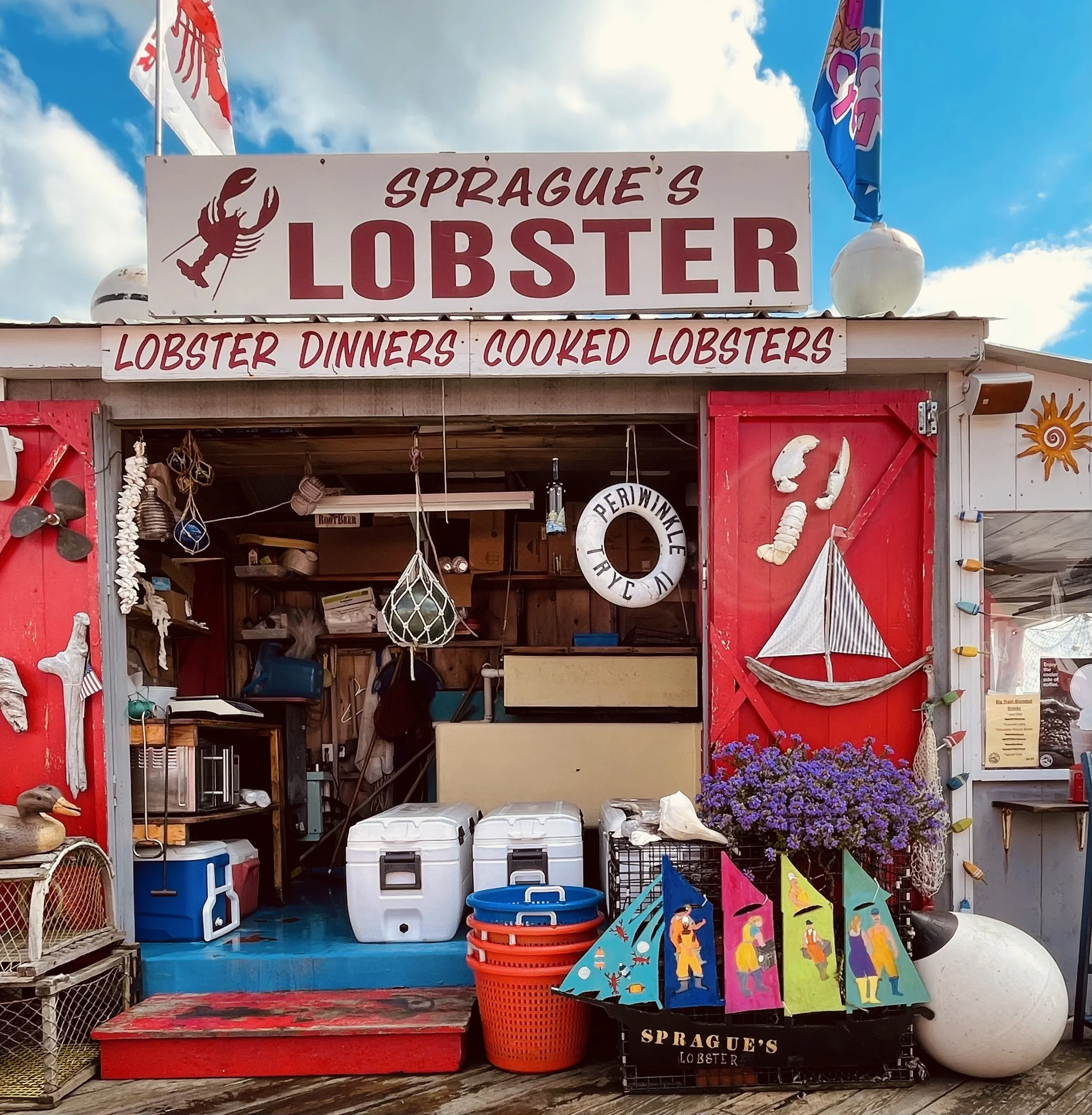 A seafood stand named 'Sprague's Lobster' selling cooked lobsters with a sign and various decorations, including a model sailboat, flags, flowers, and colorful banners.