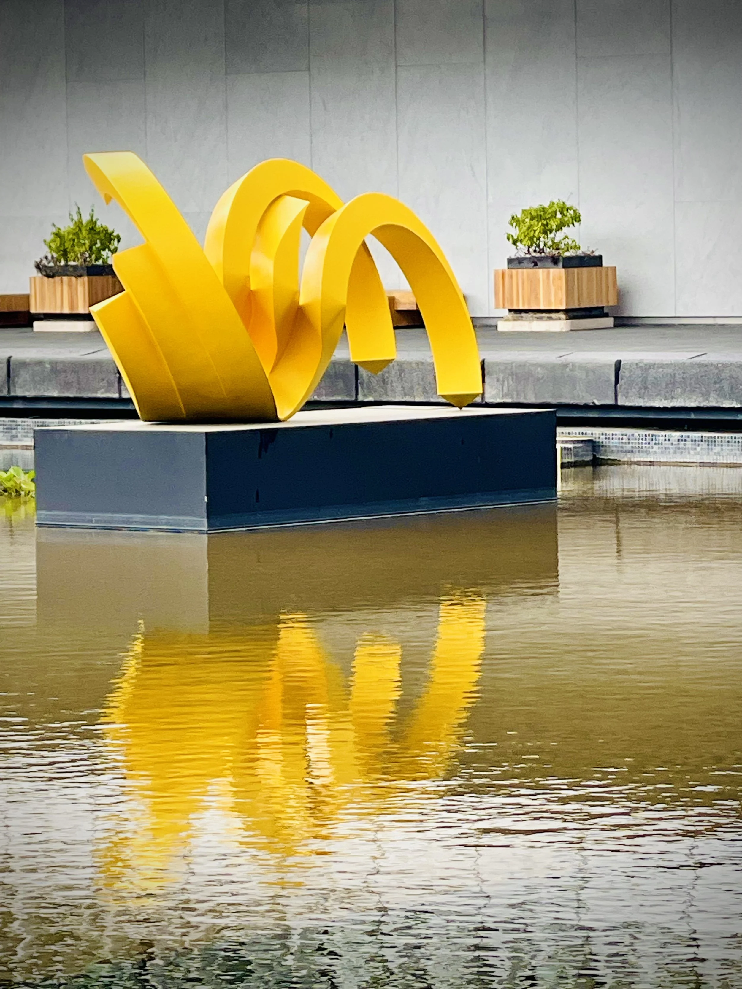 Golden arches sculpture of McDonald's logo reflecting in a water fountain.