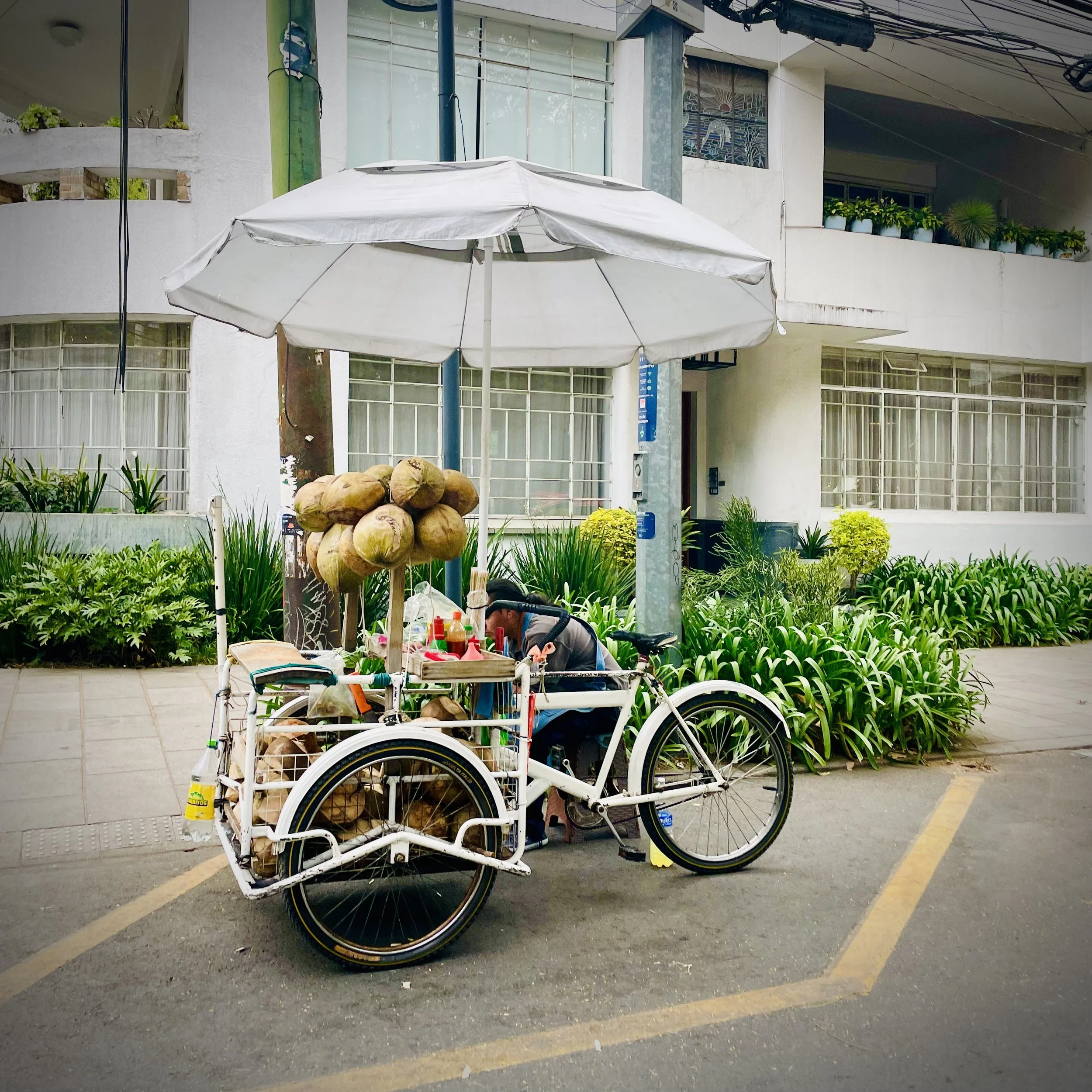 A white tricycle with a large umbrella attached is parked on a city street. The tricycle has a basket filled with coconuts and bottles, and a vendor is preparing items underneath the umbrella. In the background, there is a modern white building with