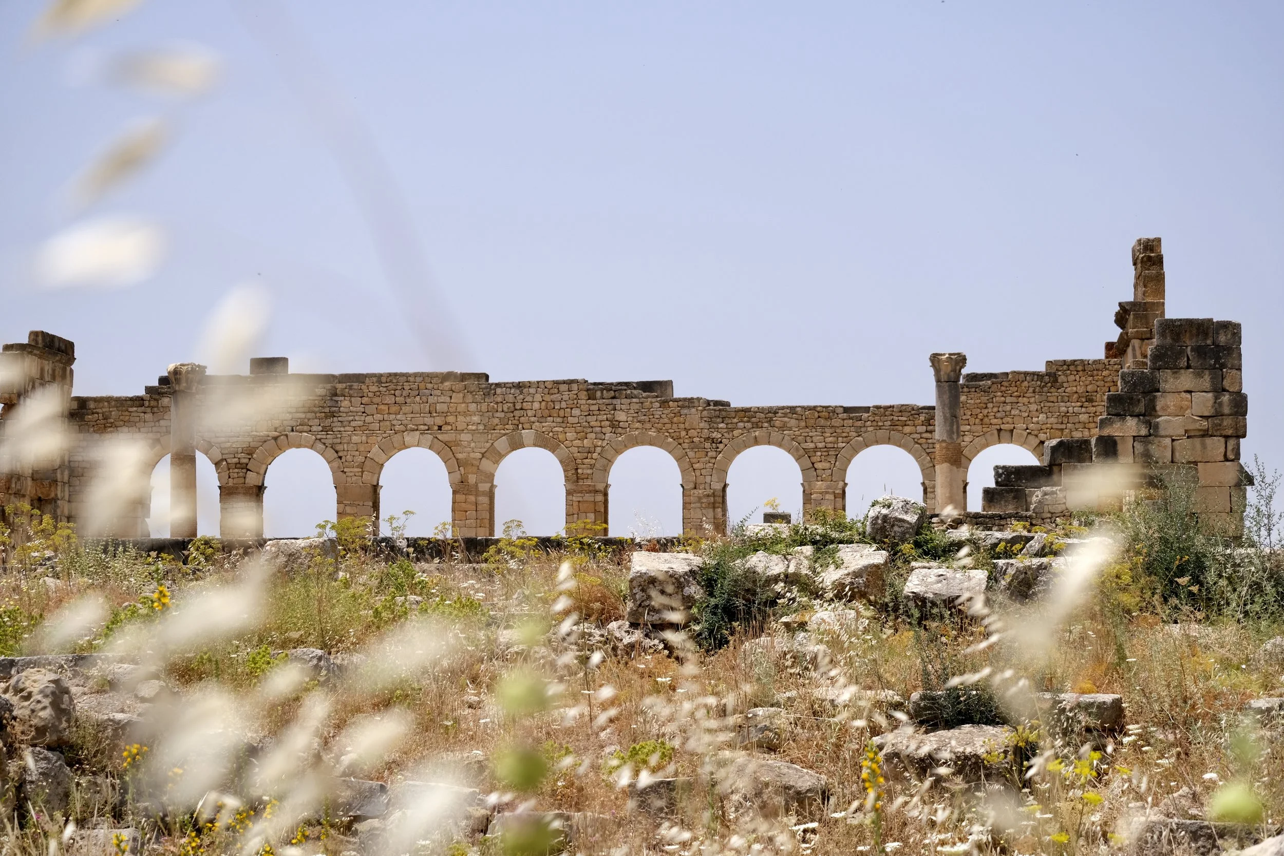 Ancient stone Roman aqueduct with multiple arches, partially ruined, on a landscape with grasses and wildflowers, under a clear sky.