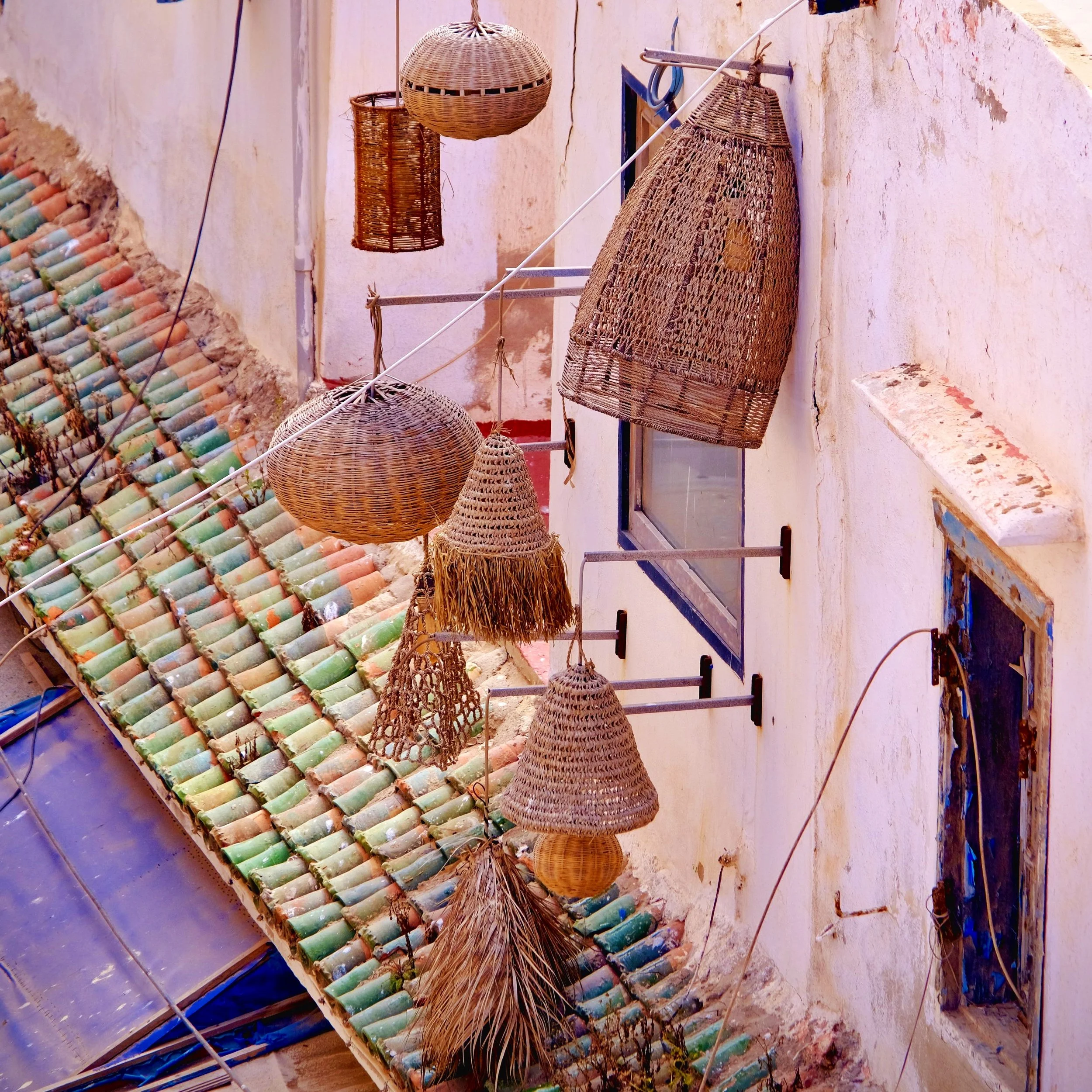 Colored tiled roof and hanging woven lamps and baskets on a rustic courtyard wall.