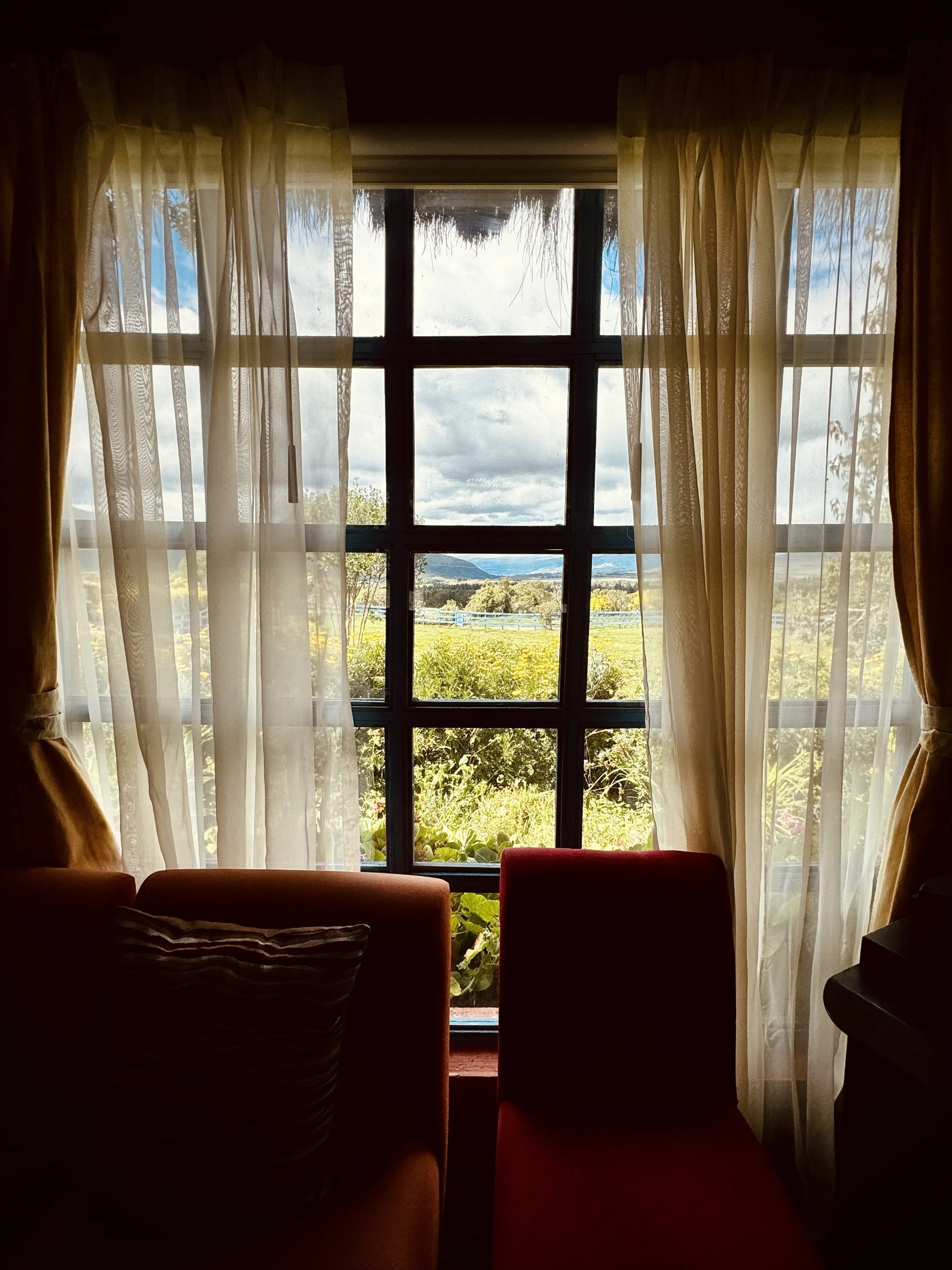 A view through a window with sheer white curtains, revealing a landscape of trees, greenery, clouds, and mountains in the distance.