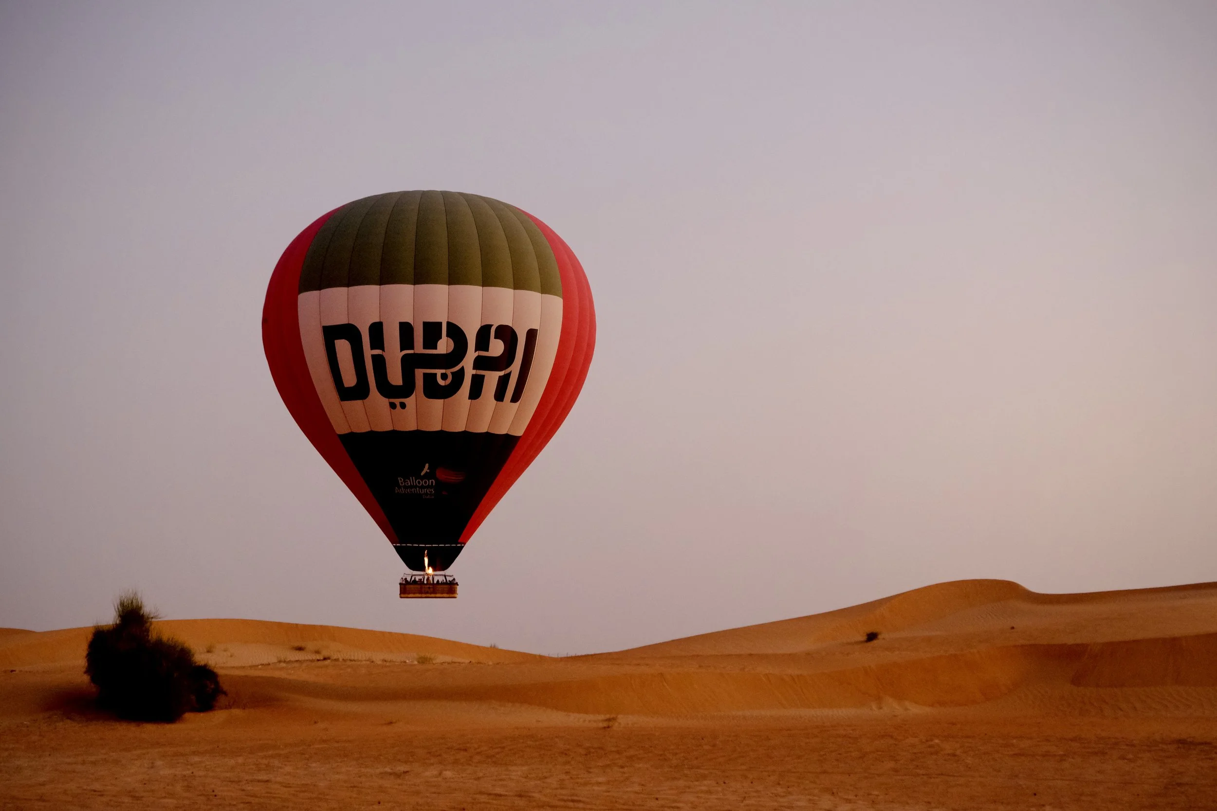 Hot air balloon floating above a sandy desert with dunes and sparse vegetation at sunset.
