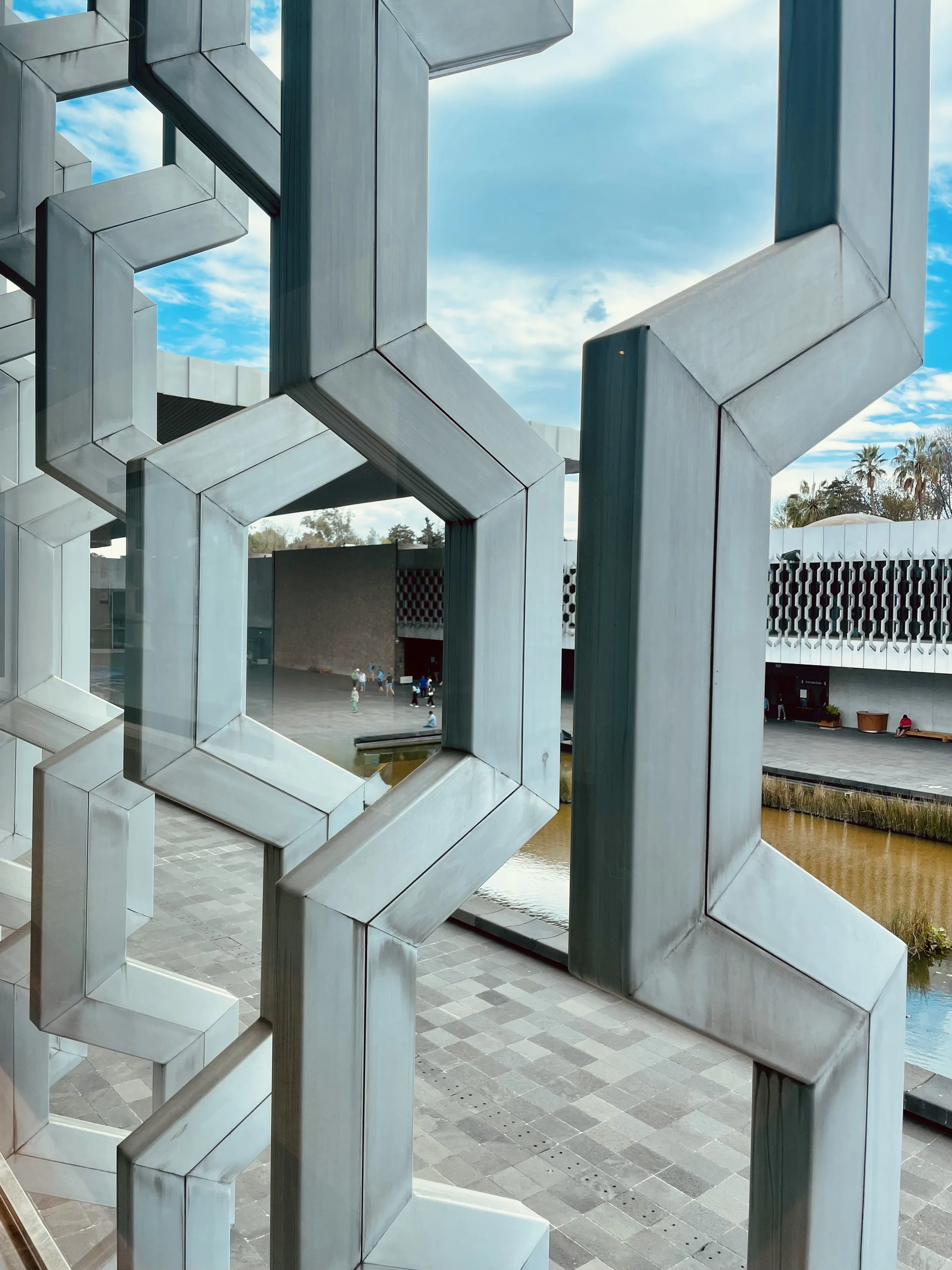 A modern architectural structure made of metallic geometric shapes, with open spaces showing a courtyard with a small body of water, people walking, and a building with a patterned facade in the background.