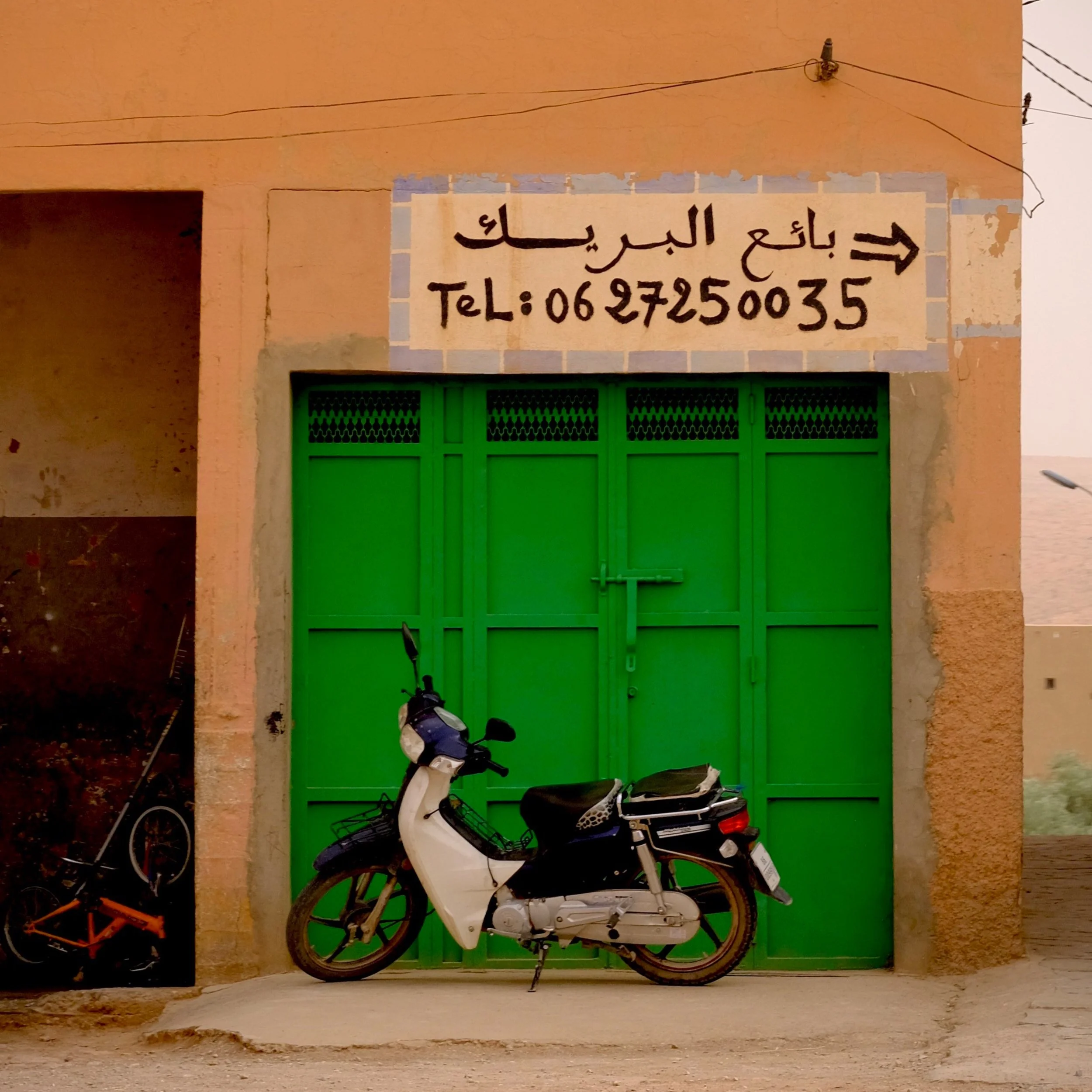 A green metal gate in front of a beige building with an Arabic sign and phone number. A white motorcycle is parked in front of the gate.