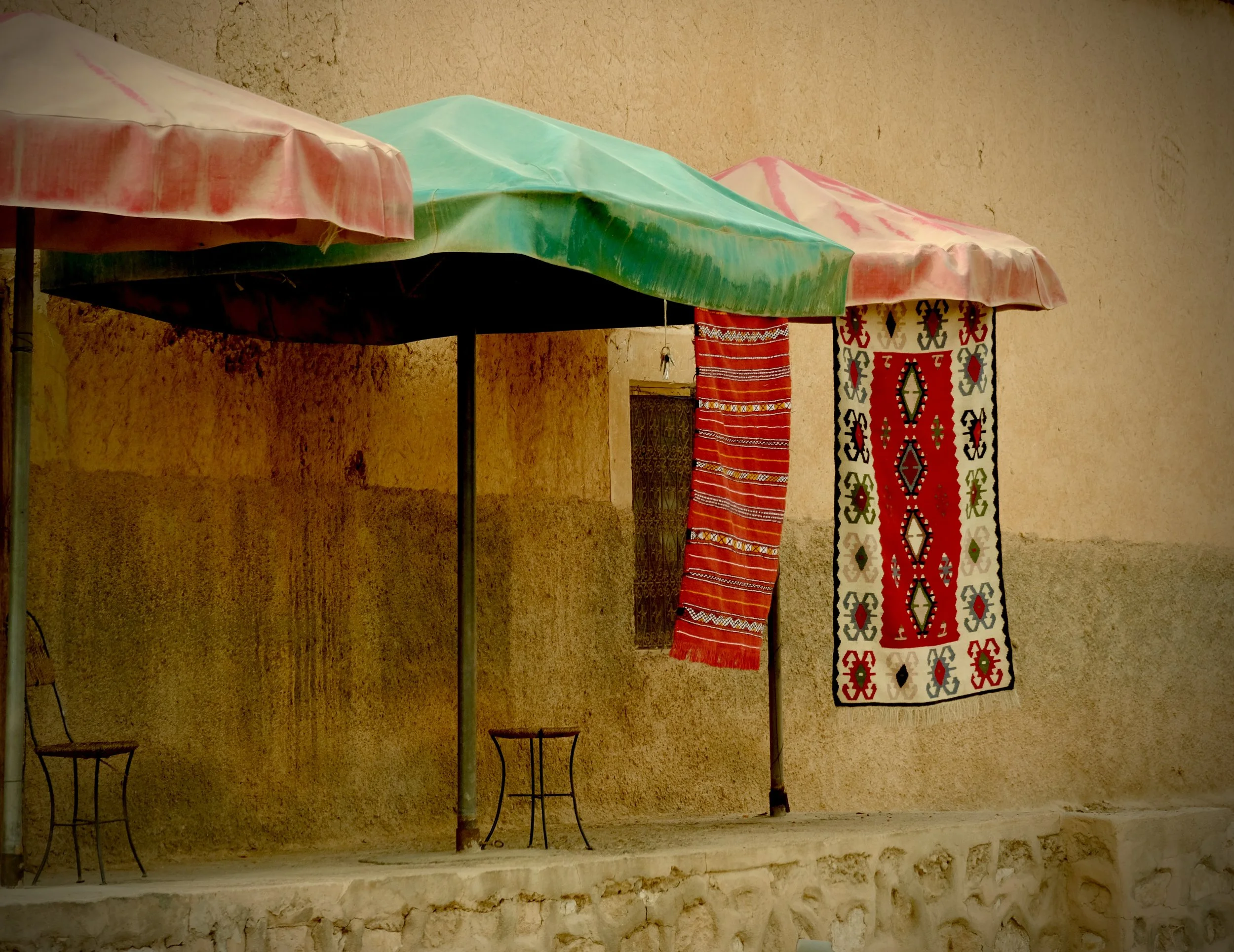 Two colorful umbrellas, one pink and one green, set against a textured beige wall. Two red and white patterned rugs hang on the wall, with small black wire chairs on the stone ground in front.
