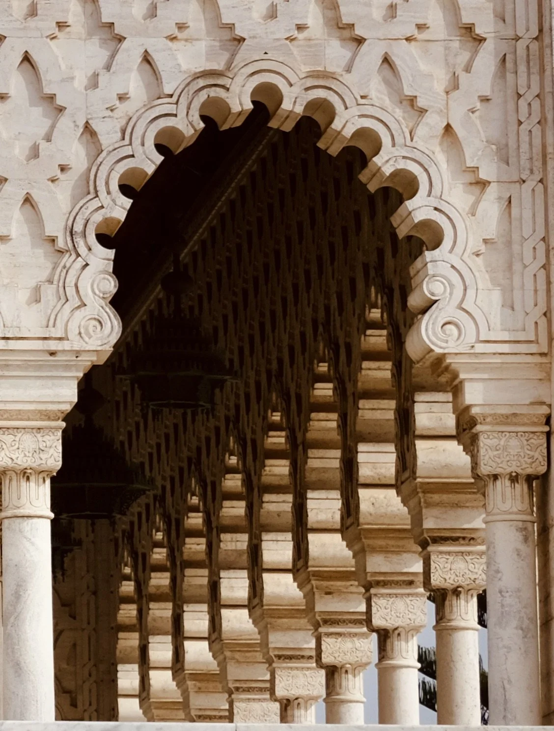 Archway with geometric and floral carvings, supported by columns, leading to a staircase and hanging lanterns.
