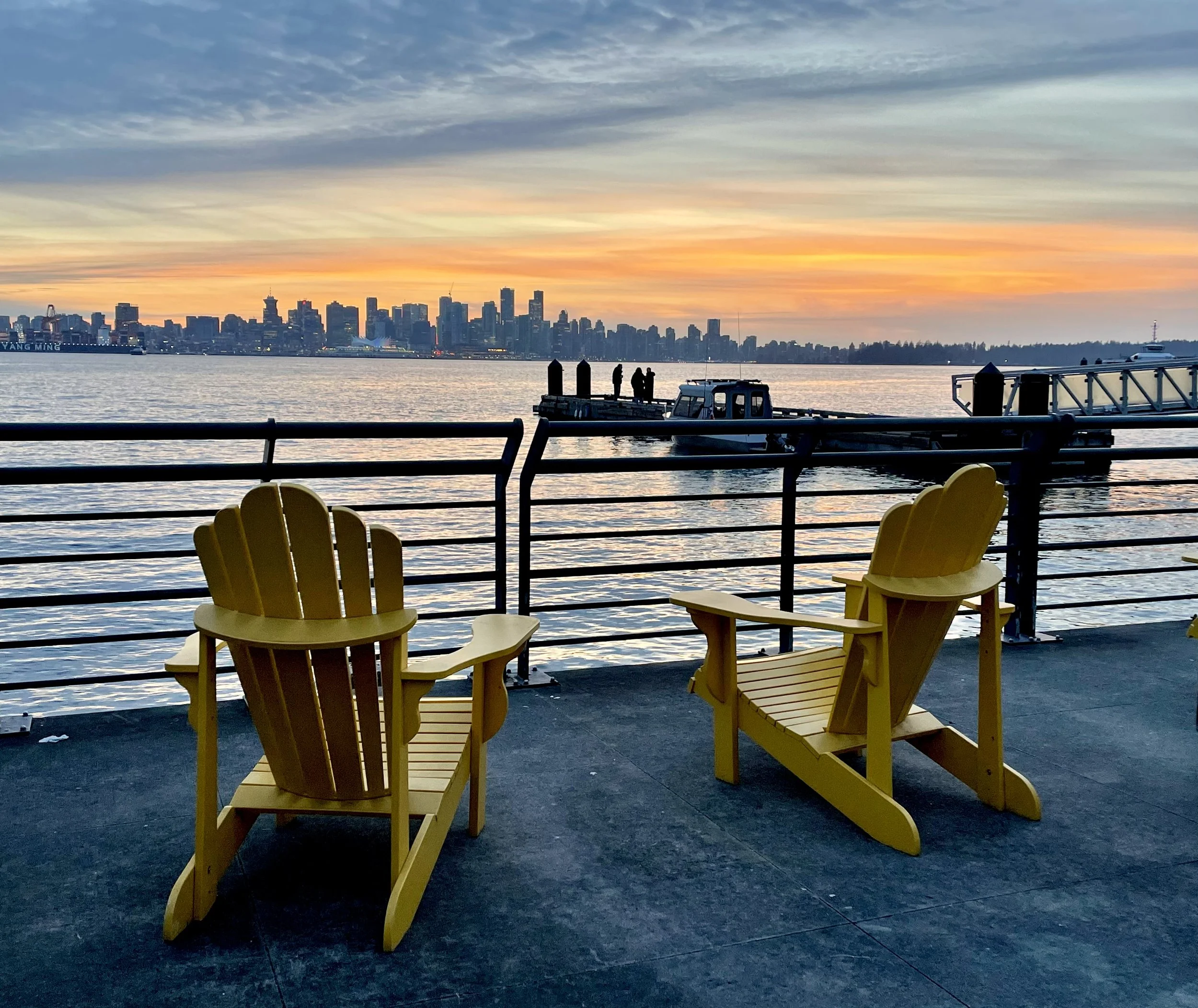 Yellow Adirondack chairs on a waterfront promenade overlooking a city skyline at sunset