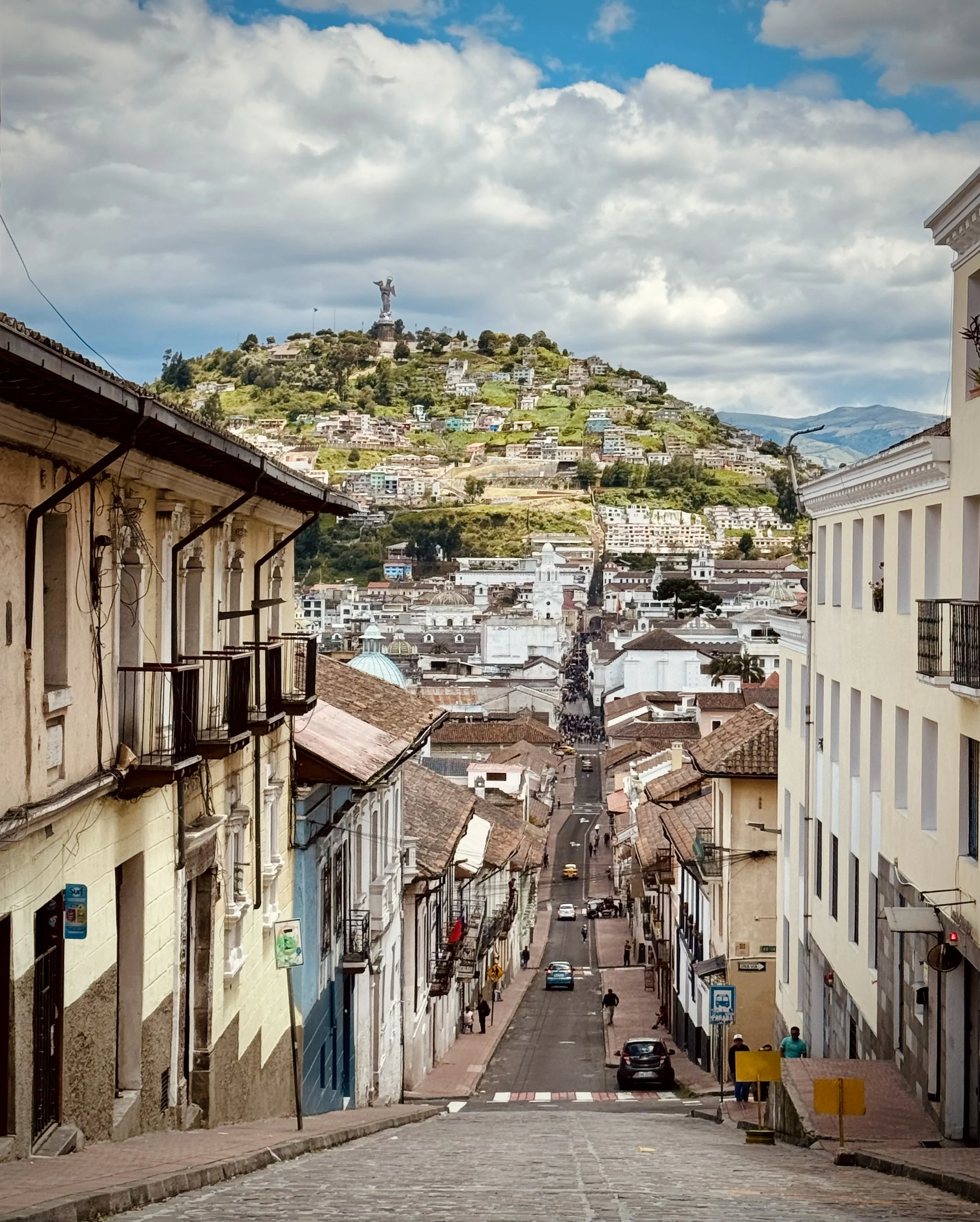 Street view in a historic city with hilly terrain and a large statue on top of the hill in the distance.