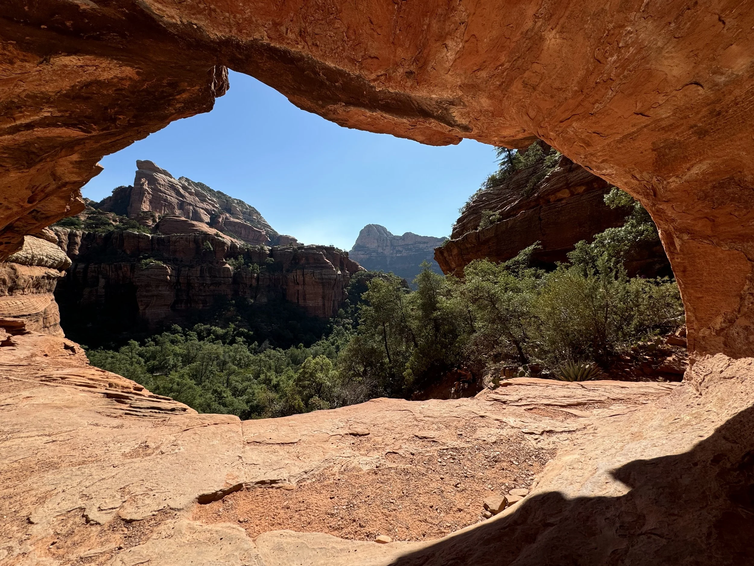 View of a desert canyon landscape with red rock formations and green trees, seen through a natural rock frame.