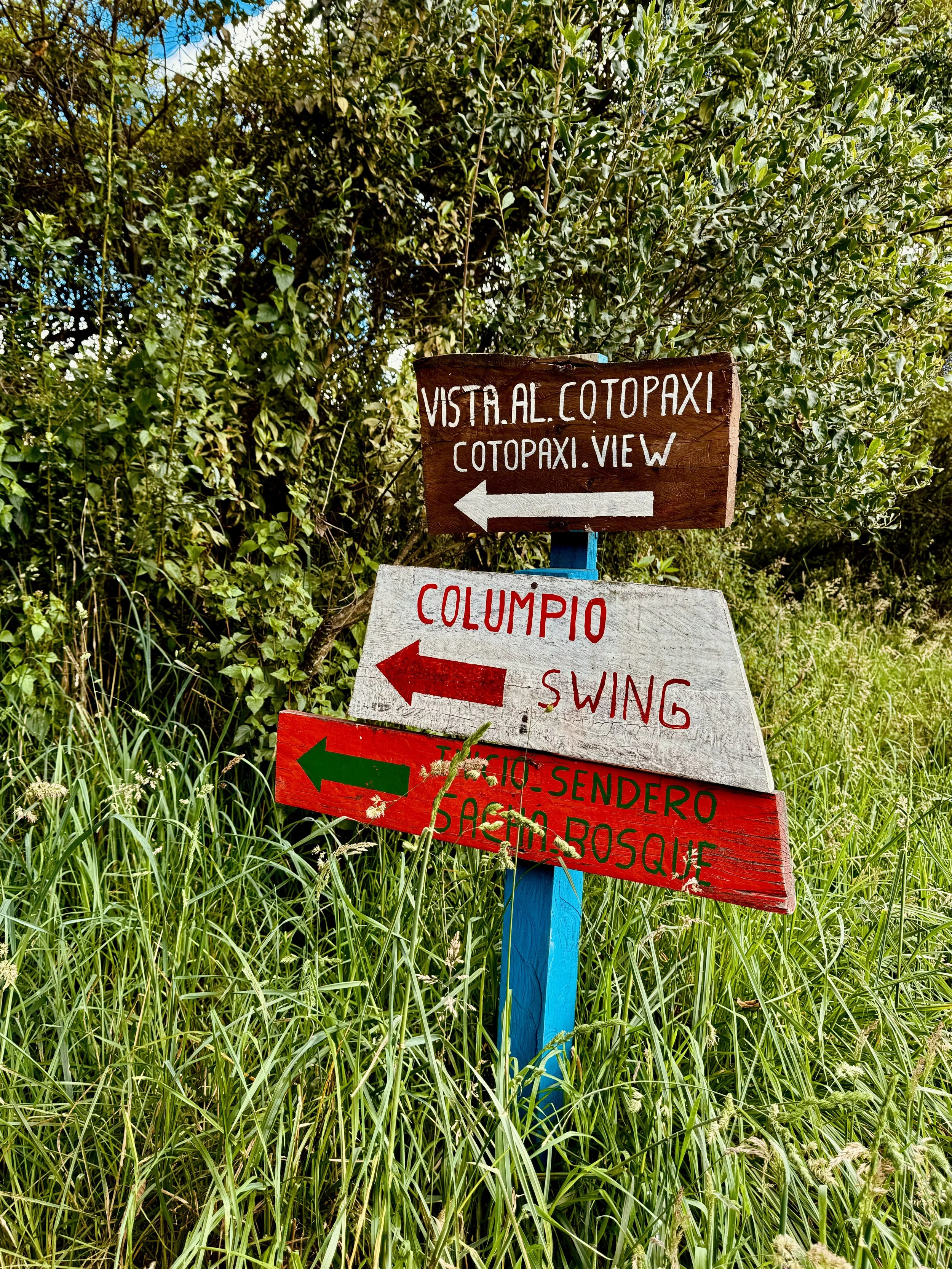 Signpost with three colored directional signs in a grassy area with green bushes and trees in the background. The top sign is brown and points left, reading 'VISTA AL COTOPAXI' and 'COTOPAXI VIEW'. The middle sign is white with red text and points le