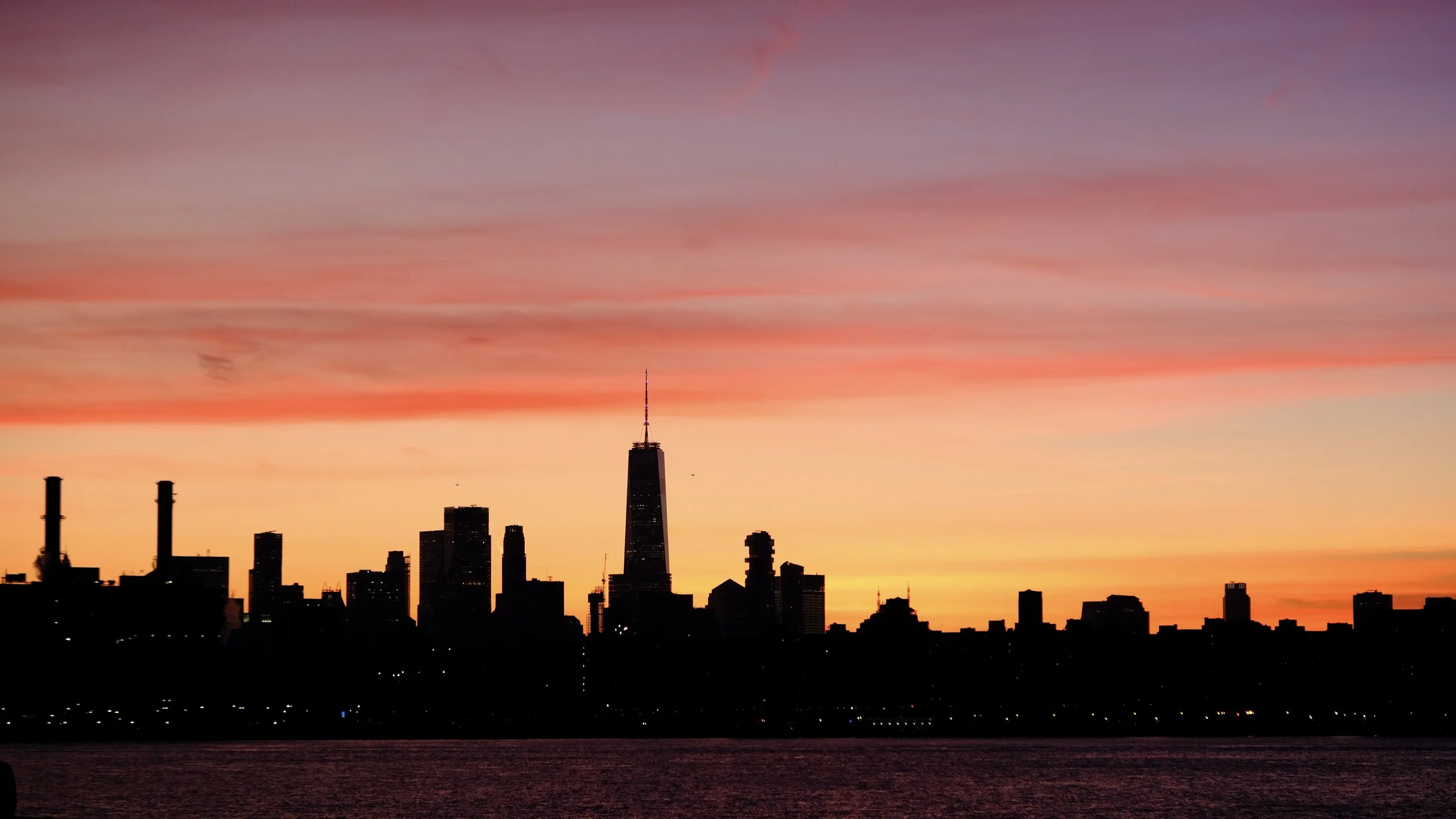 Skyline of a city at sunset with silhouettes of buildings and colorful sky in pink, orange, and purple hues.